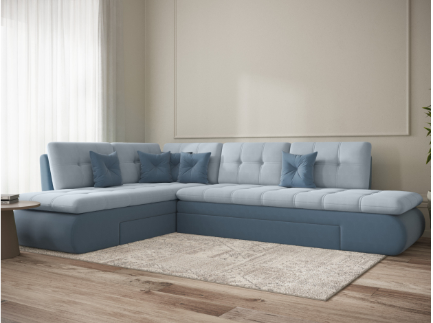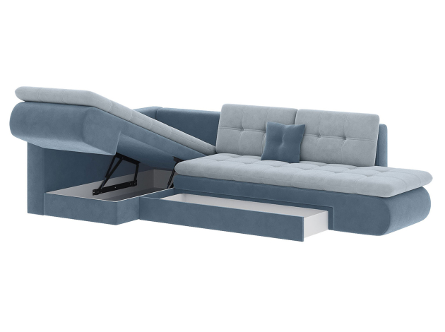 Для хранения постельных принадлежностей предусмотрено два короба. Более вместительный расположен в угловой секции и оснащен подъемным механизмом, а в удлиненной части дивана находится дополнительный выдвижной ящик.