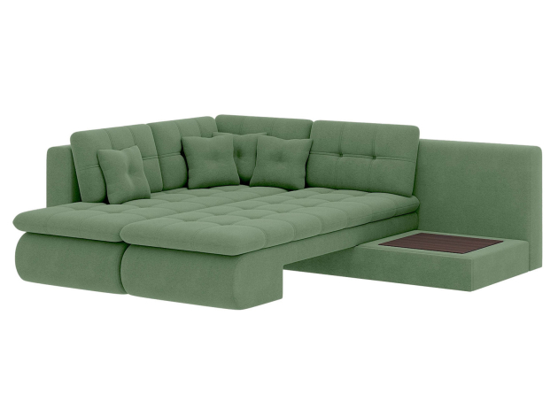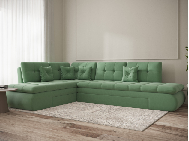 Модель оснащена инновационным поворотным механизмом, который за несколько секунд превращает угловой диван в двуспальную кровать. Высокое изголовье защищает от соприкосновения со стеной во время сна. После трансформации с одной стороны открывается удобный столик с термостойким покрытием. В неразложенном виде диван можно использовать в качестве комфортного спального места для одного человека.