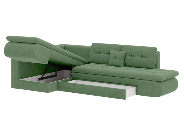 Для хранения постельных принадлежностей предусмотрено два короба. Более вместительный расположен в угловой секции и оснащен подъемным механизмом, а в удлиненной части дивана находится дополнительный выдвижной ящик.