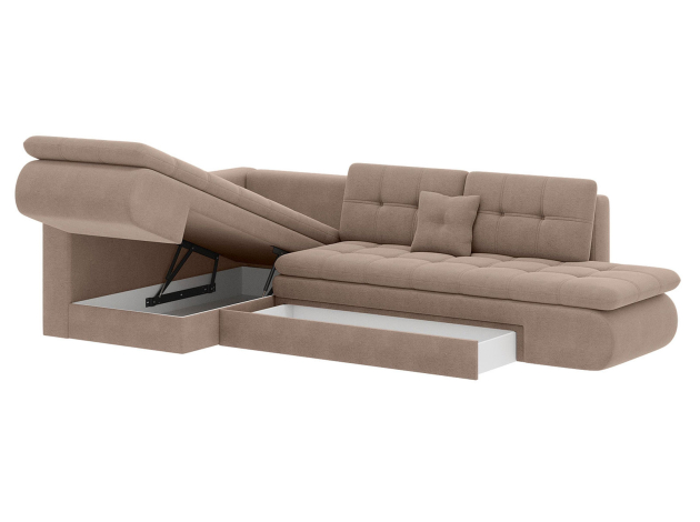 Для хранения постельных принадлежностей предусмотрено два короба. Более вместительный расположен в угловой секции и оснащен подъемным механизмом, а в удлиненной части дивана находится дополнительный выдвижной ящик.