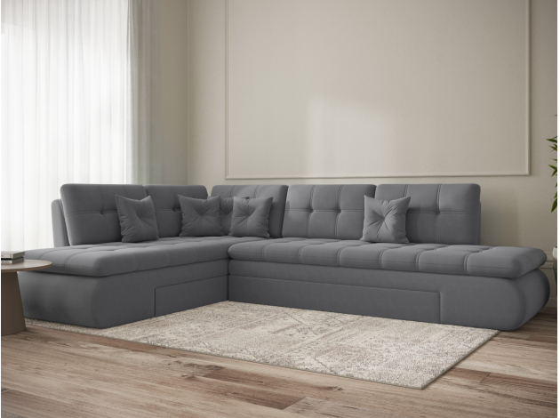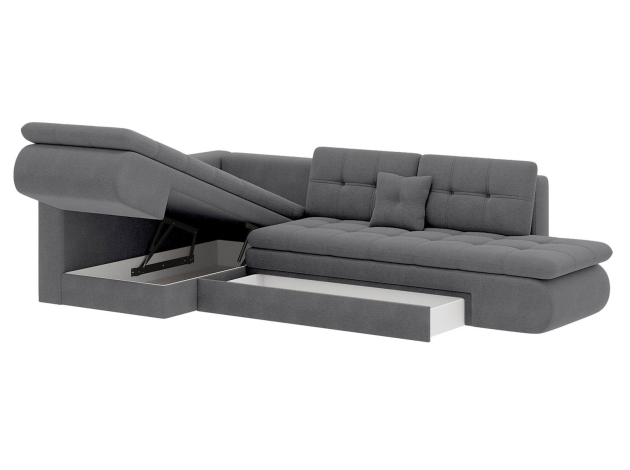 Для хранения постельных принадлежностей предусмотрено два короба. Более вместительный расположен в угловой секции и оснащен подъемным механизмом, а в удлиненной части дивана находится дополнительный выдвижной ящик.