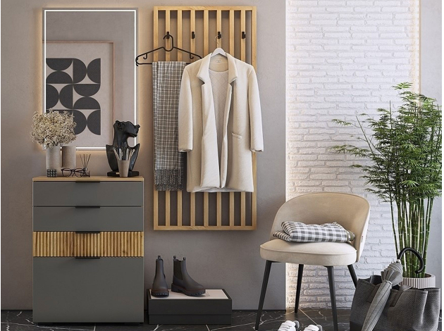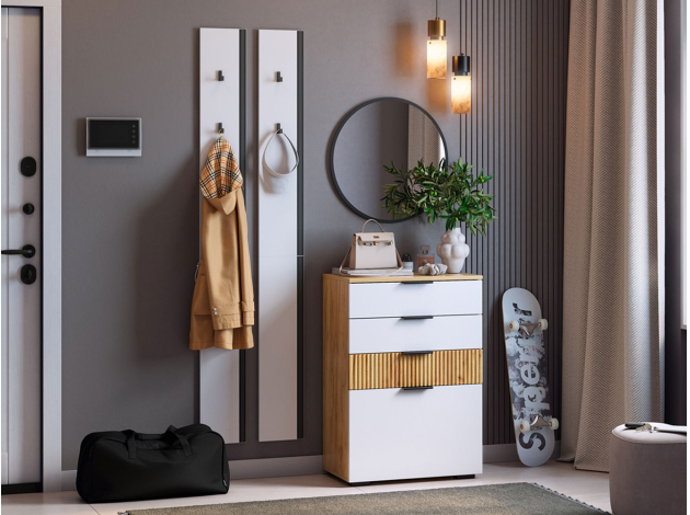В оформлении комода Адам используются древесный декор и стильная фрезеровка. Такой дизайн смотрится очень эффектно и одновременно уютно. Благодаря комбинированному наполнению в комоде можно удобно разместить множество нужных вещей. Небольшая глубина позволяет установить модель даже в узком пространстве.