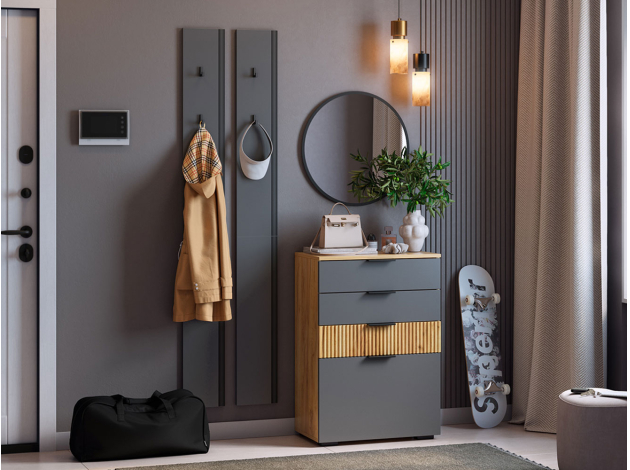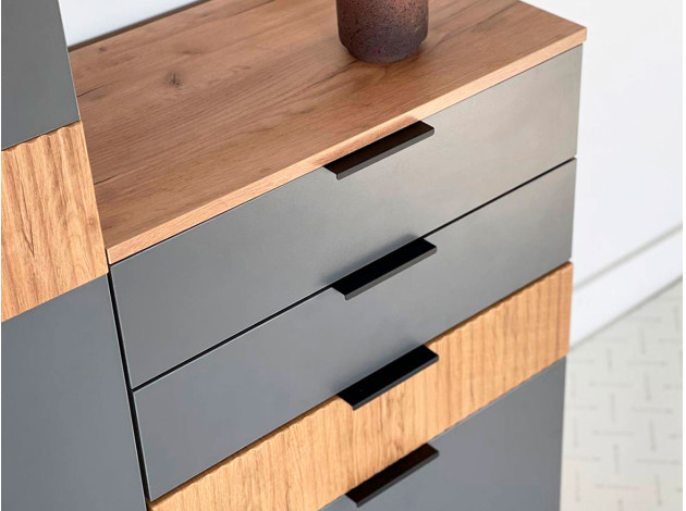 В оформлении комода Адам используются древесный декор и стильная фрезеровка. Такой дизайн смотрится очень эффектно и одновременно уютно. Благодаря комбинированному наполнению в комоде можно удобно разместить множество нужных вещей. Небольшая глубина позволяет установить модель даже в узком пространстве.