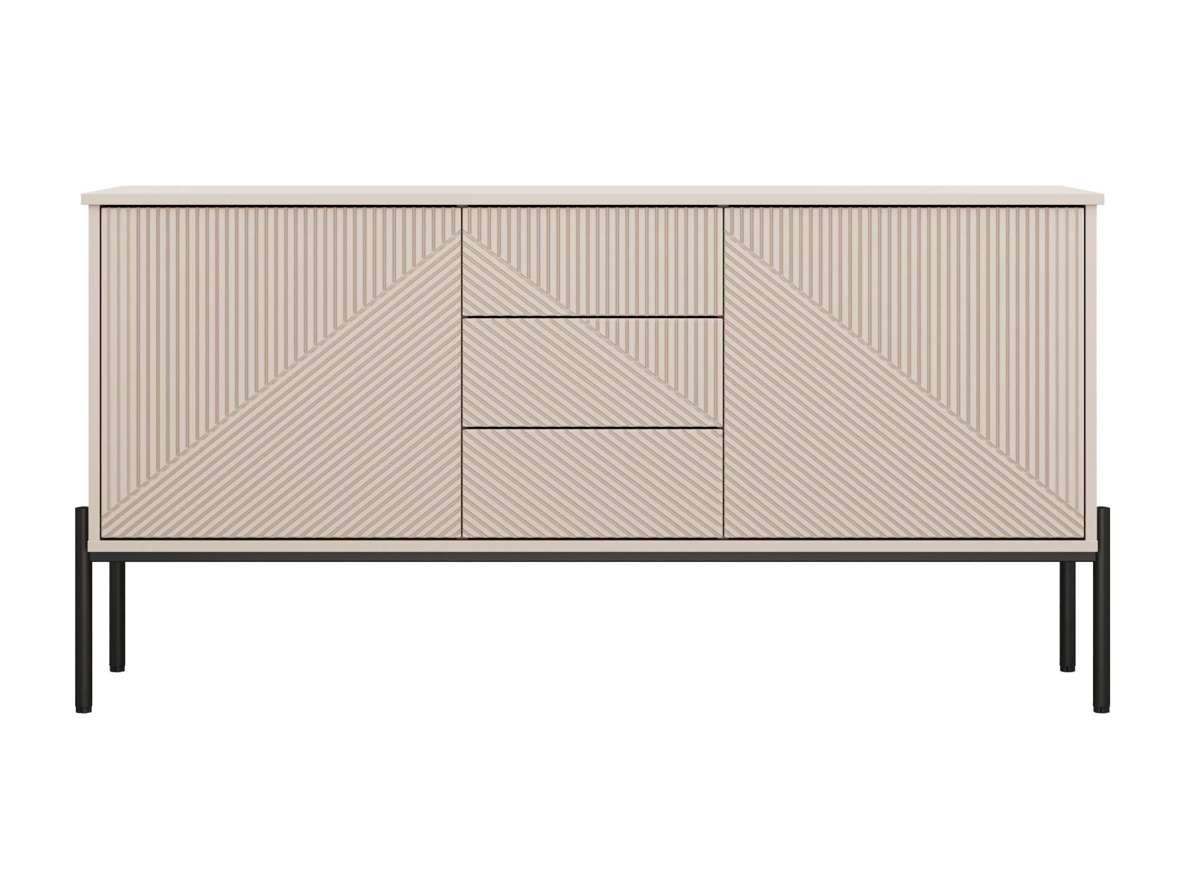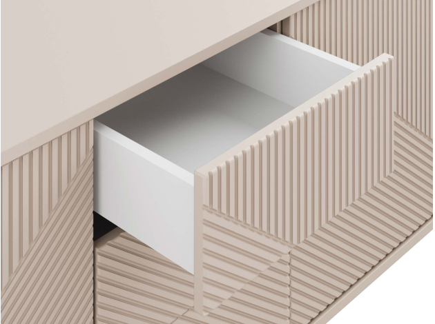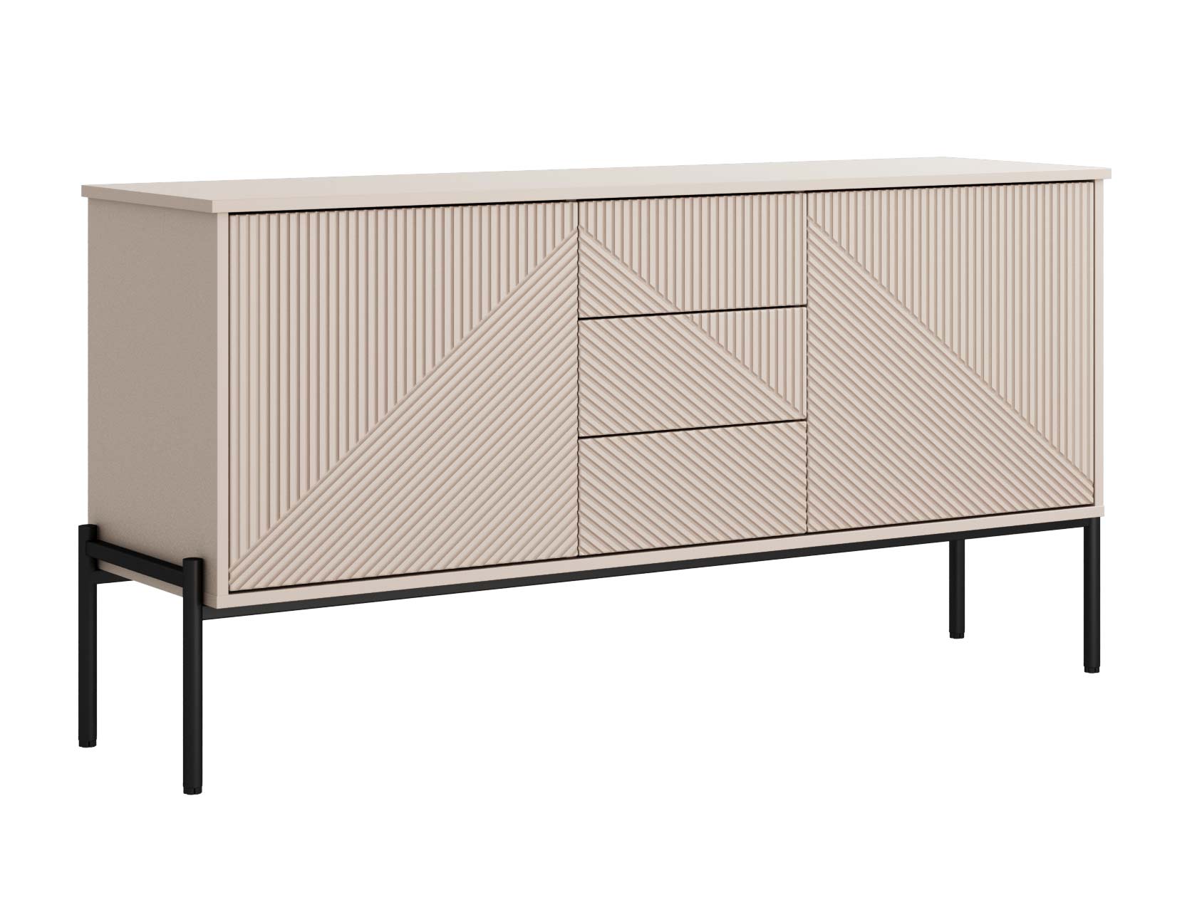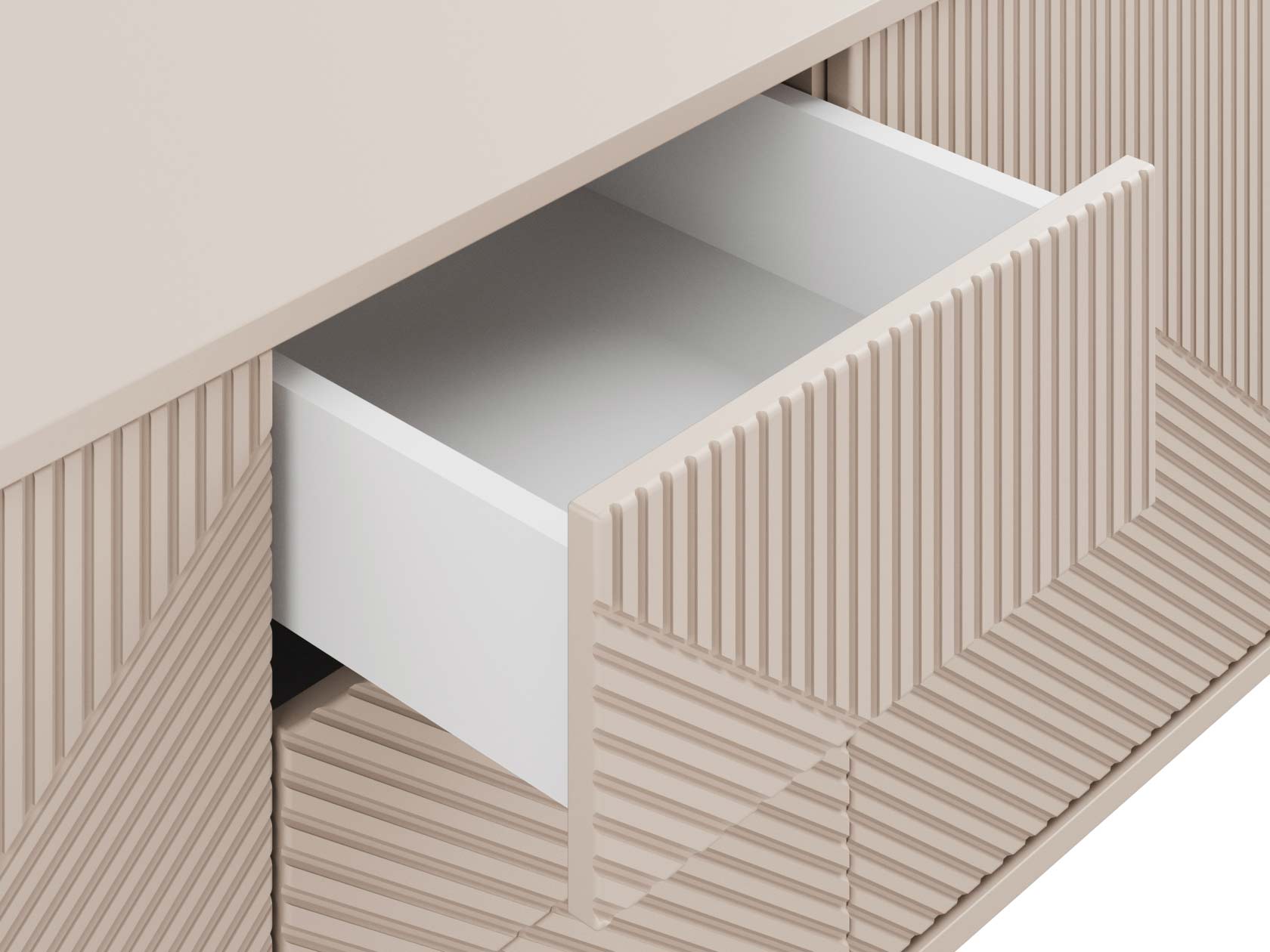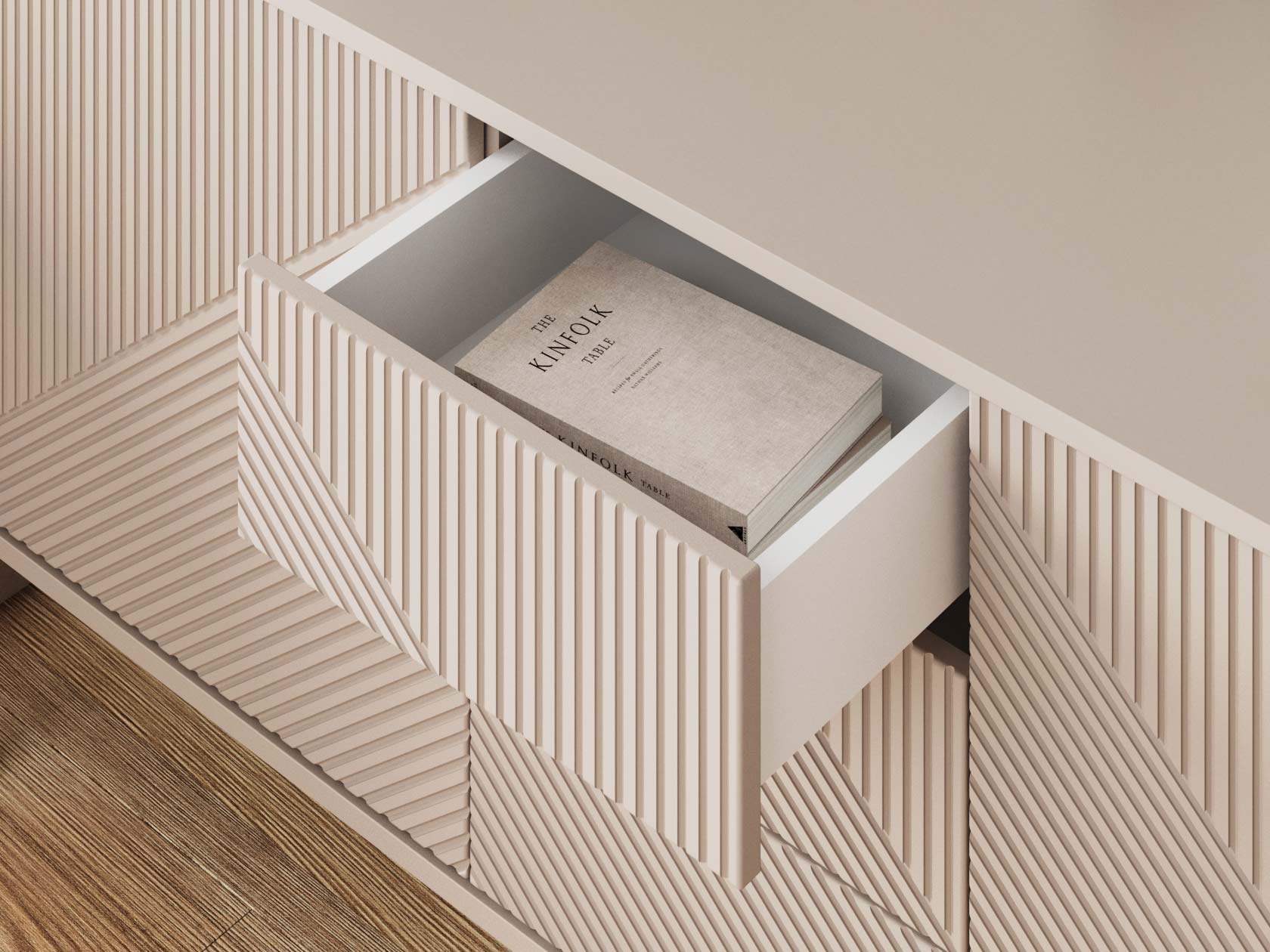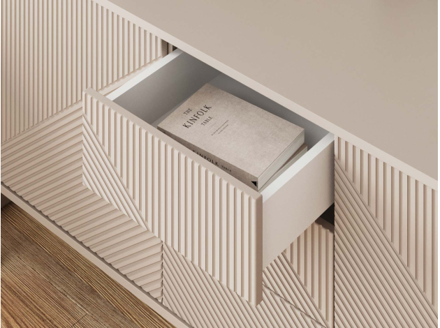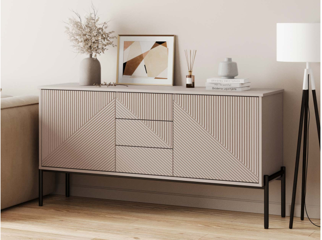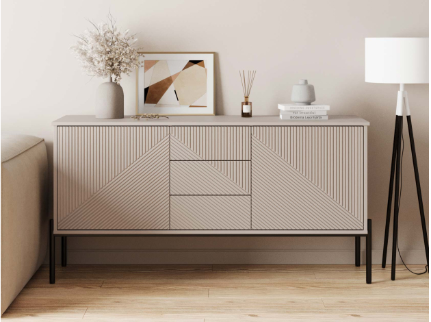 Комод Азуми 3 ящ 2 дв — прекрасный способ упорядочить хранение вещей и разнообразить интерьер. Фрезеровка на фасадах выполнена в виде геометрического узора. Такой дизайн актуален и очень привлекателен. Благодаря высоким опорам комод смотрится невесомо и подходит даже для небольшой комнаты.