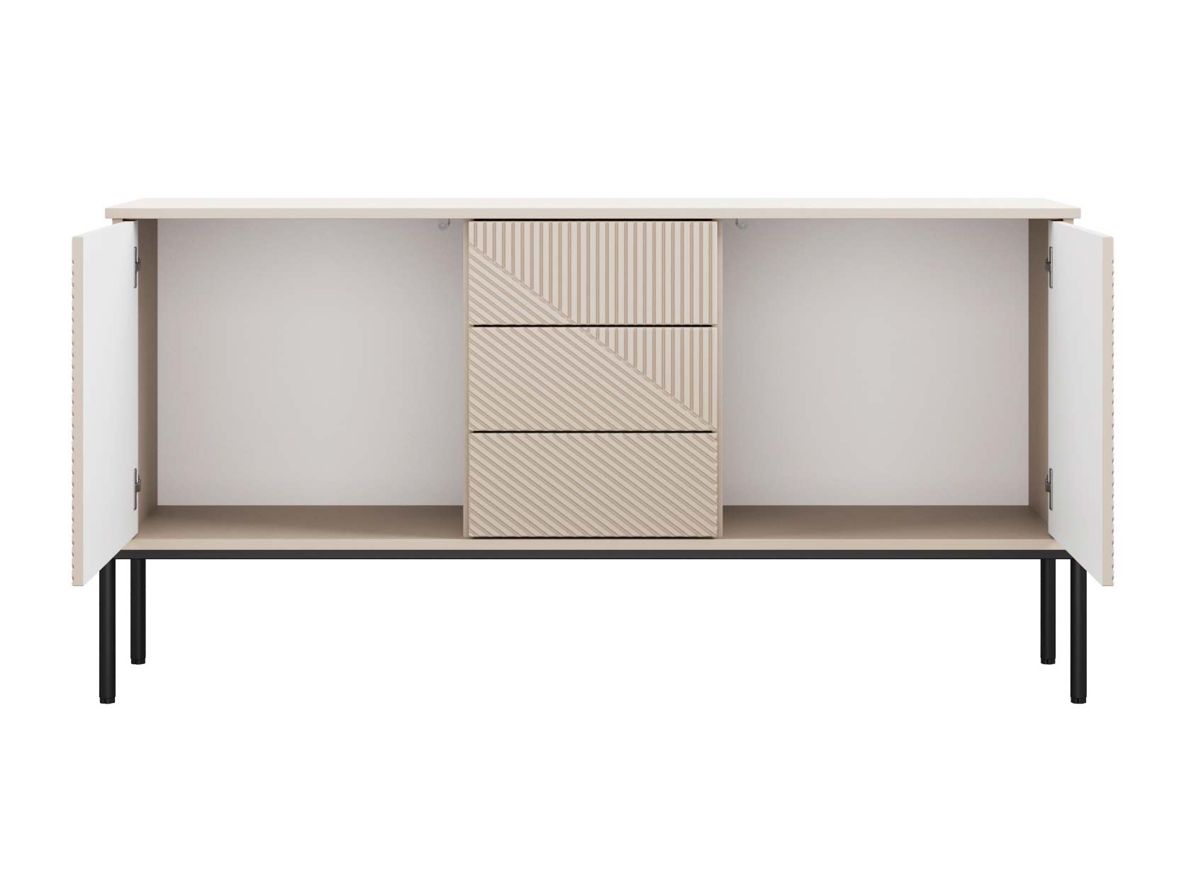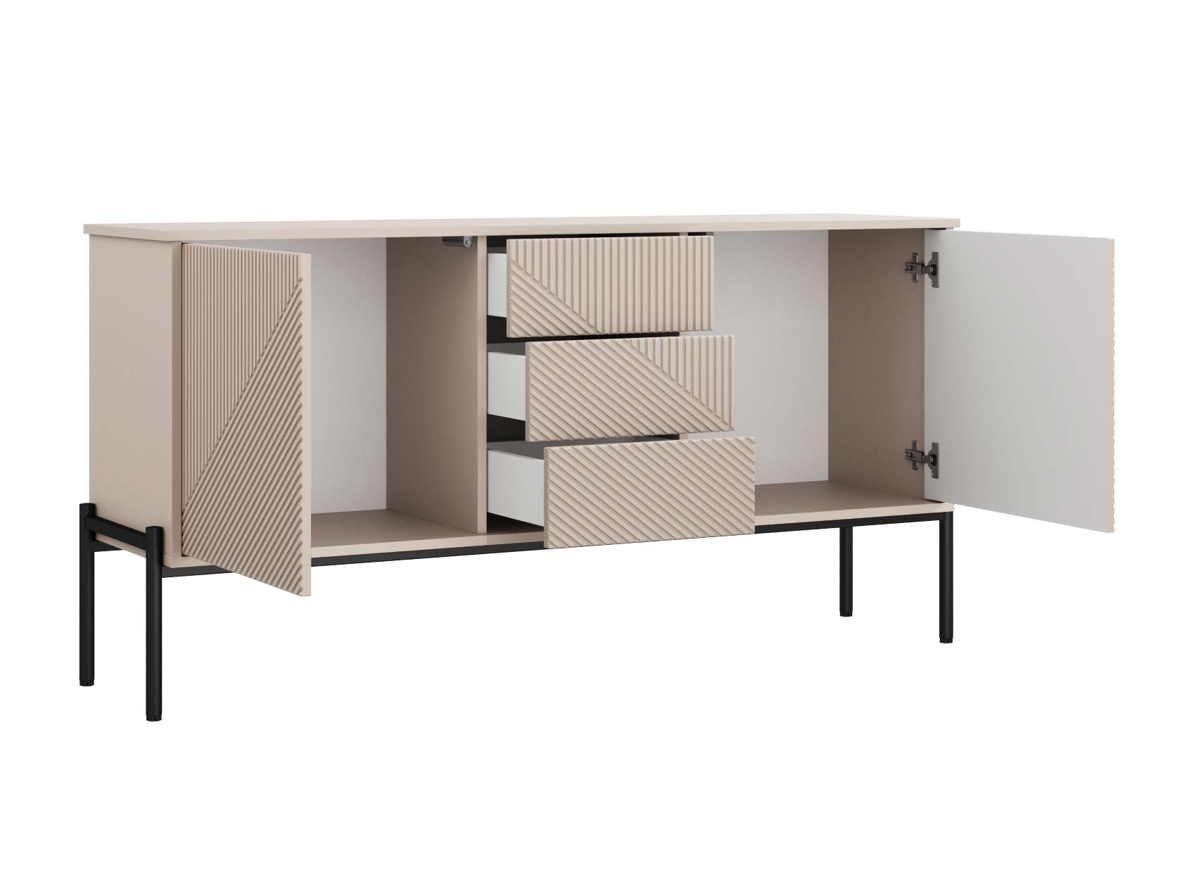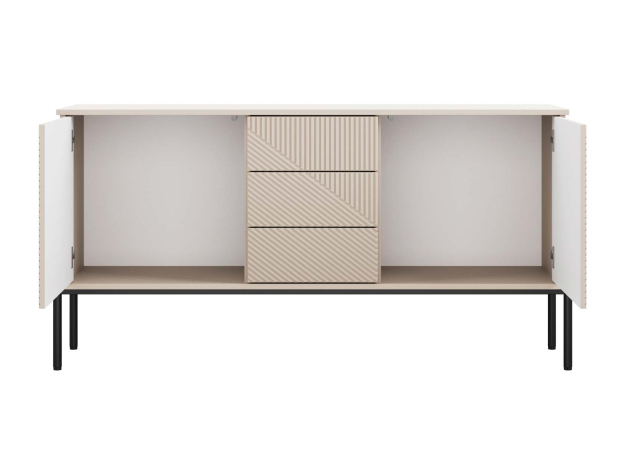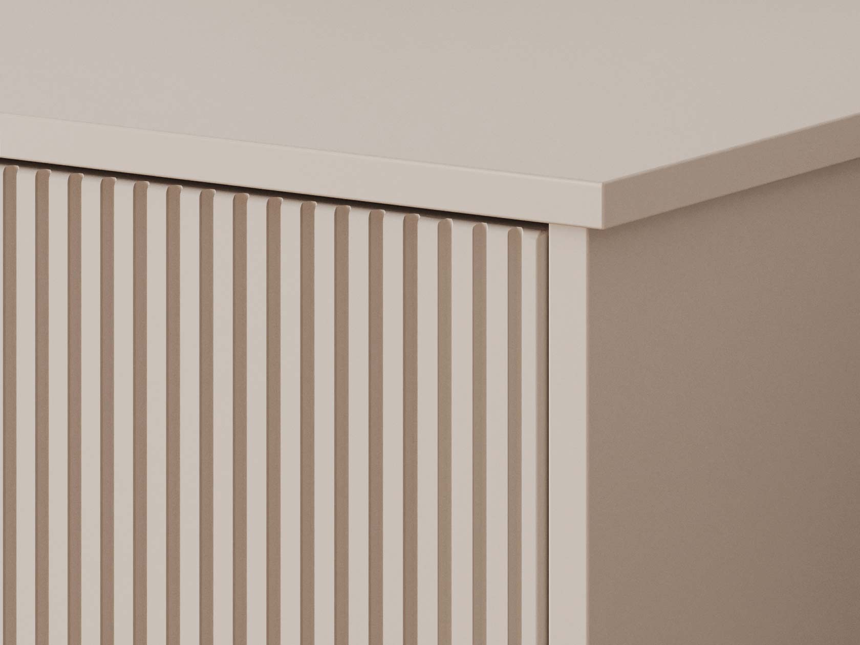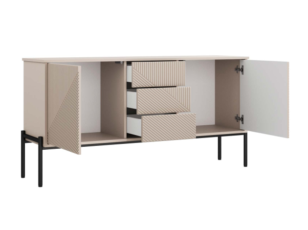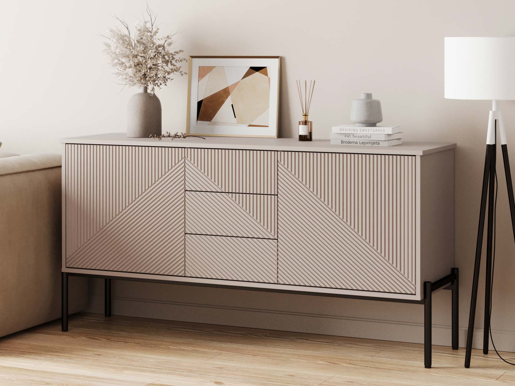 Комод Азуми 3 ящ 2 дв — прекрасный способ упорядочить хранение вещей и разнообразить интерьер. Фрезеровка на фасадах выполнена в виде геометрического узора. Такой дизайн актуален и очень привлекателен. Благодаря высоким опорам комод смотрится невесомо и подходит даже для небольшой комнаты.