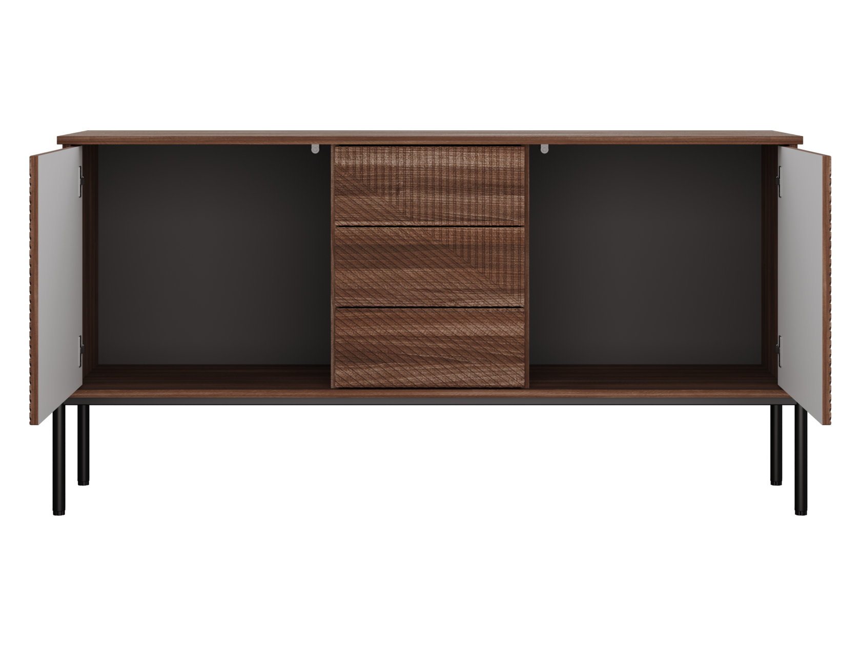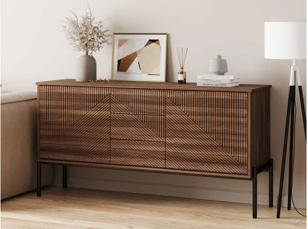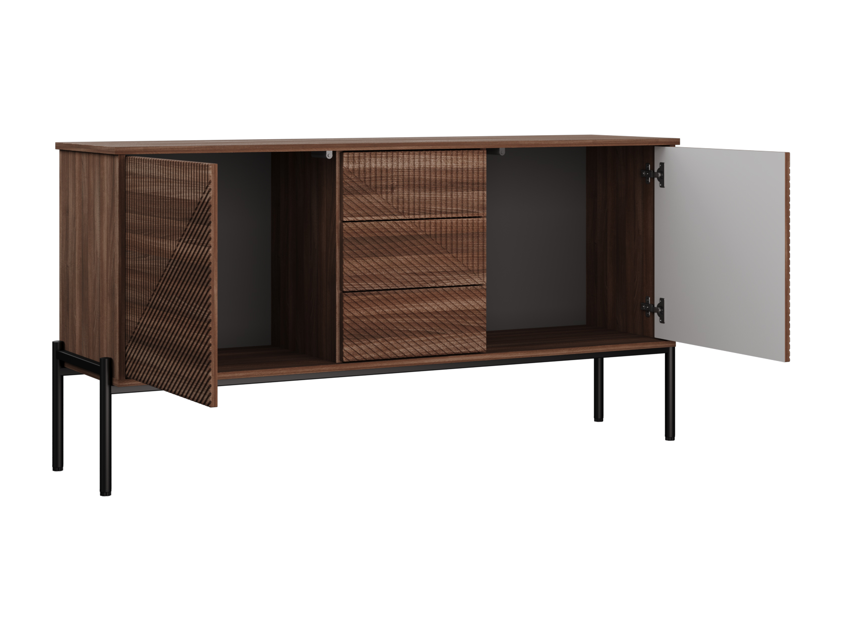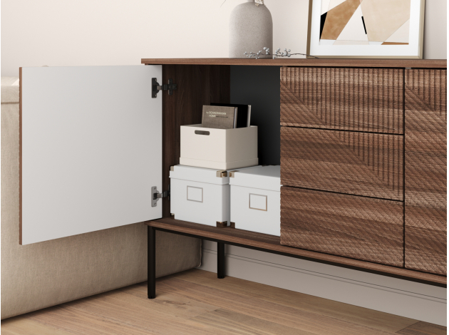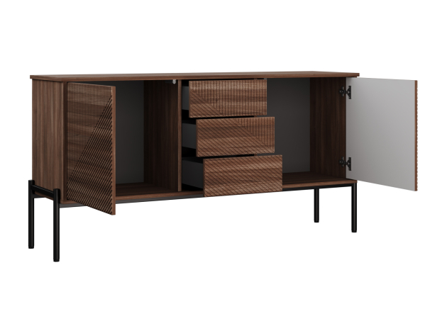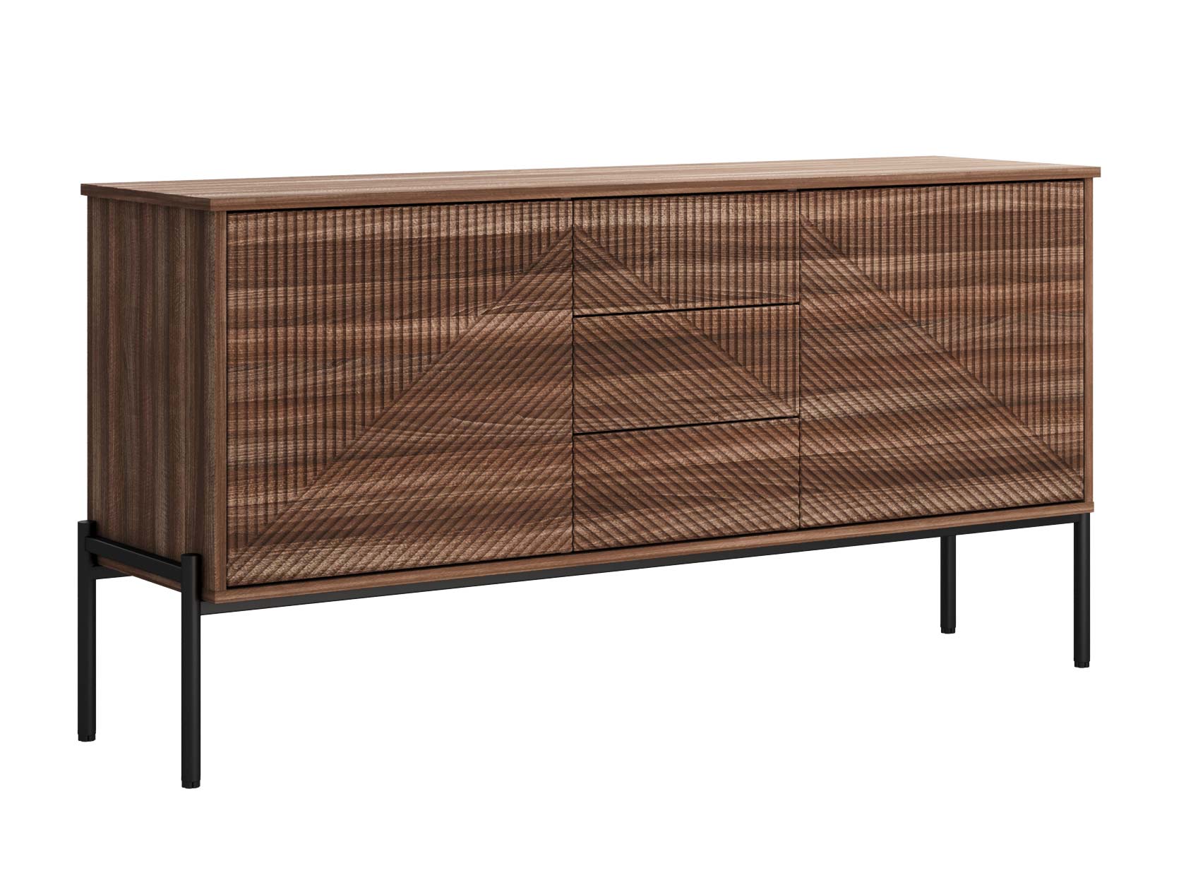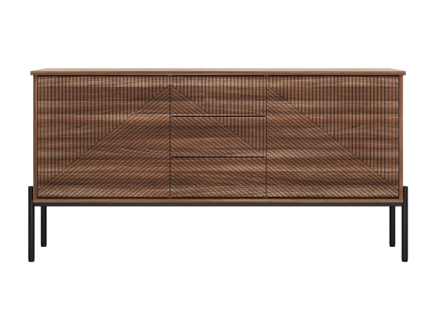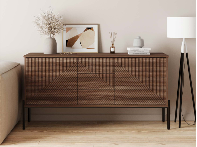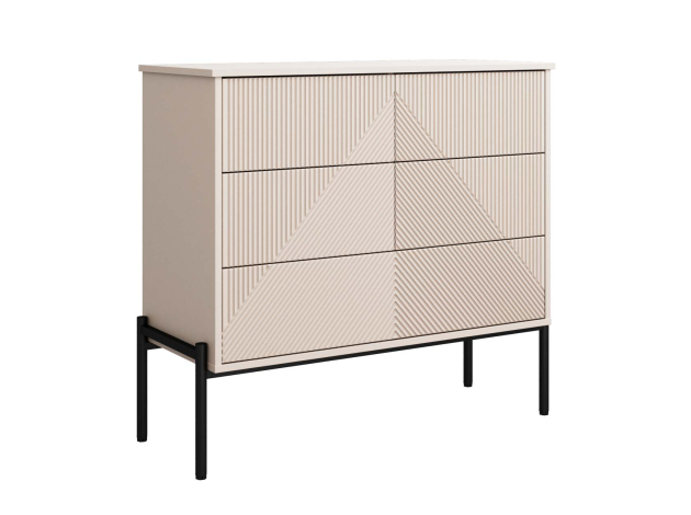 Комод Азуми 3 ящ 2 дв — прекрасный способ упорядочить хранение вещей и разнообразить интерьер. Фрезеровка на фасадах выполнена в виде геометрического узора. Такой дизайн актуален и очень привлекателен. Благодаря высоким опорам комод смотрится невесомо и подходит даже для небольшой комнаты.