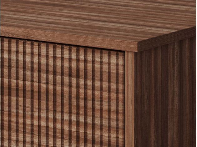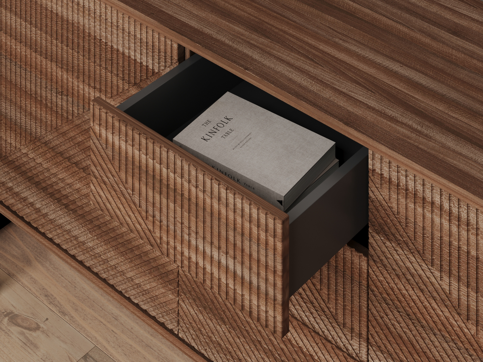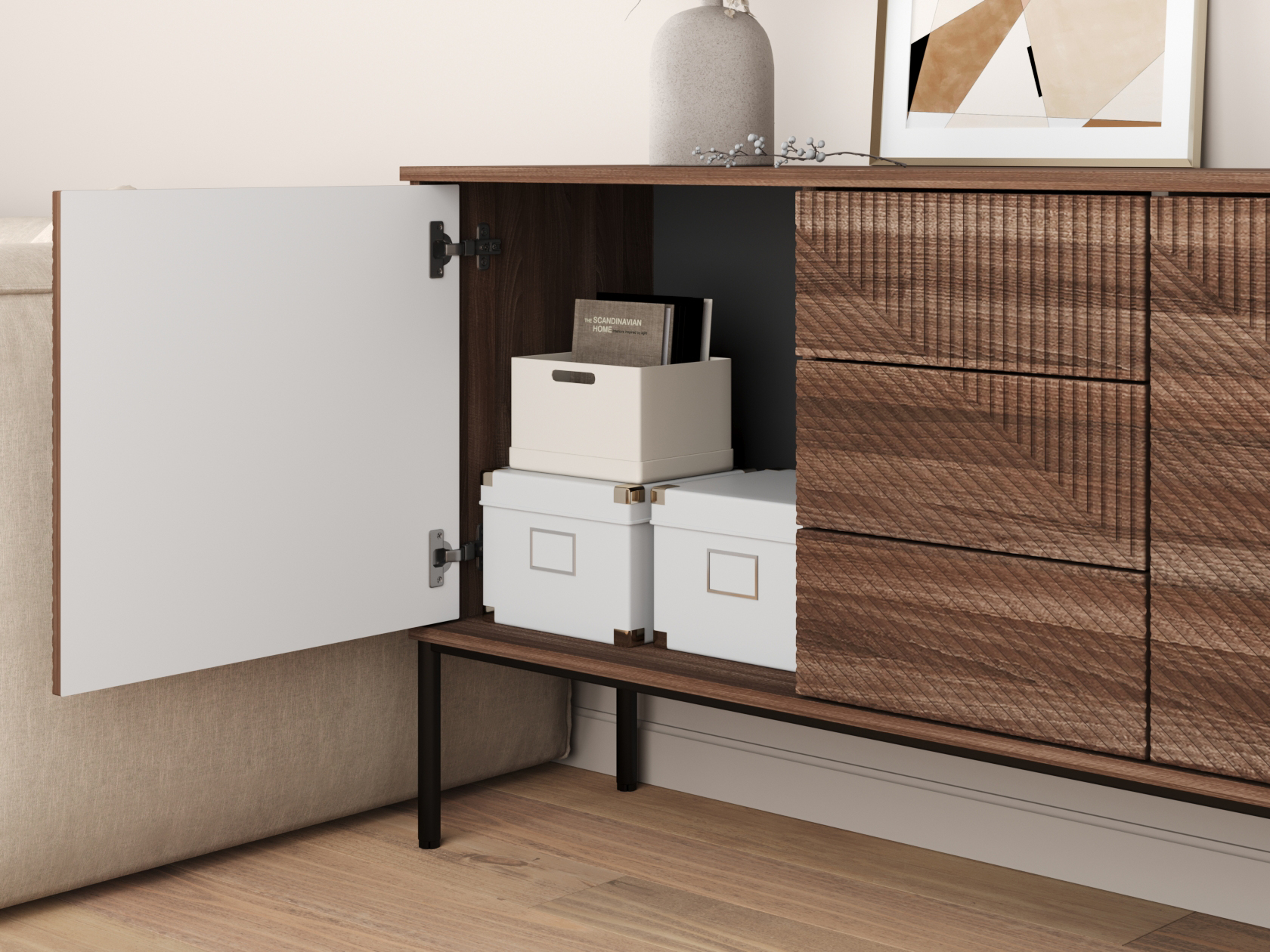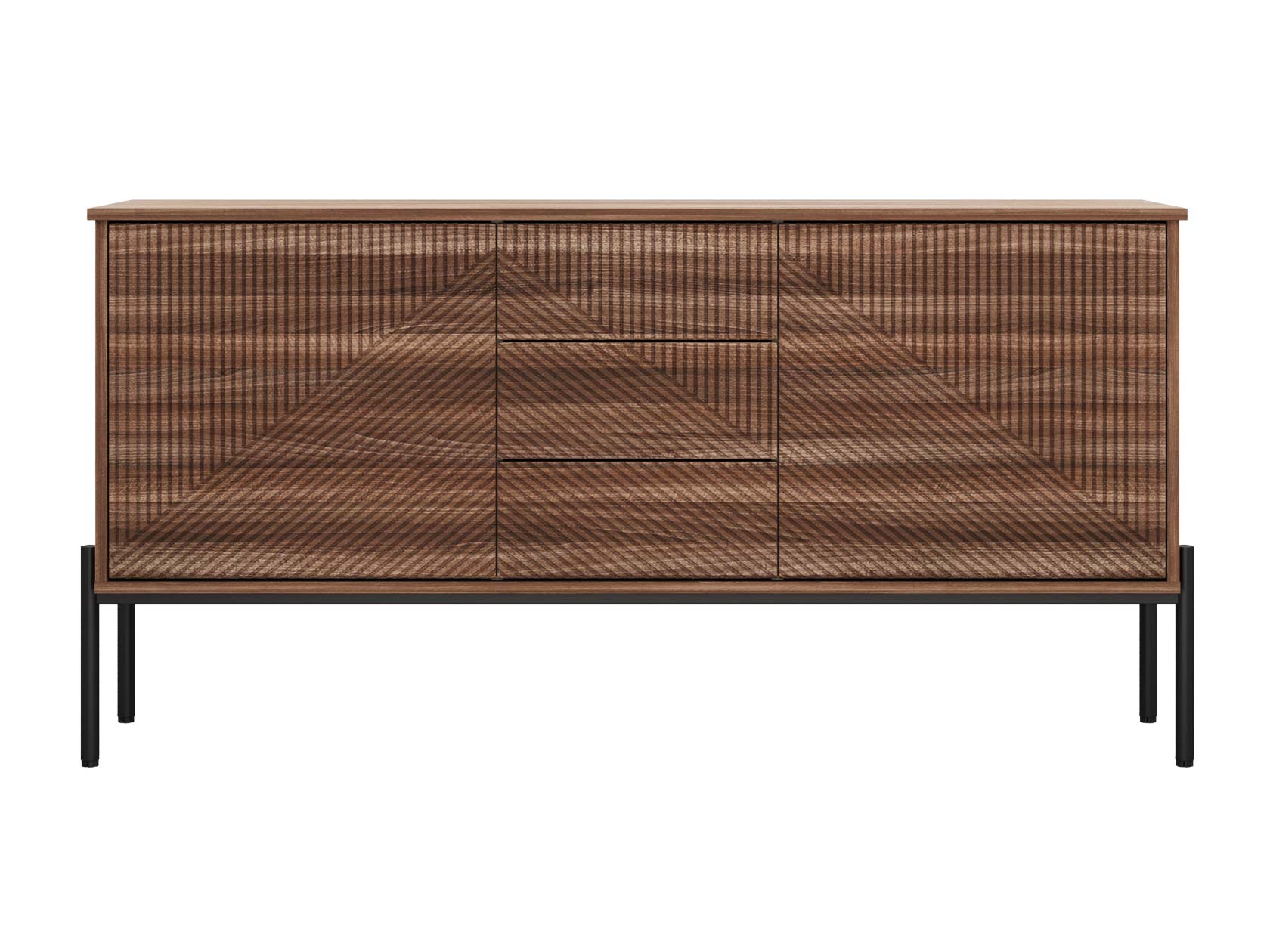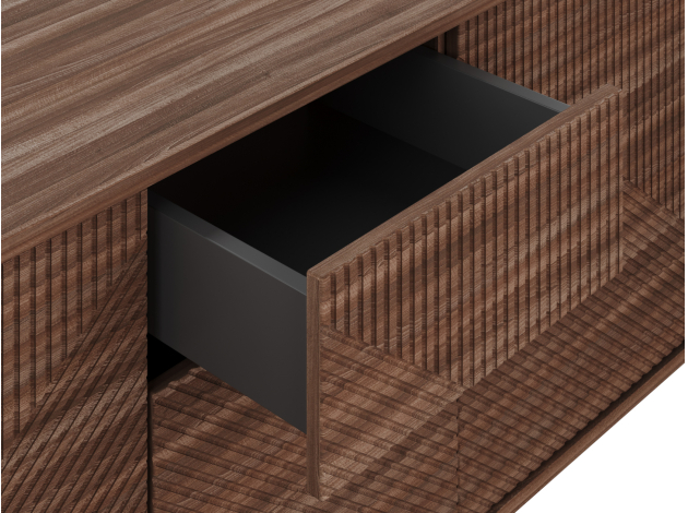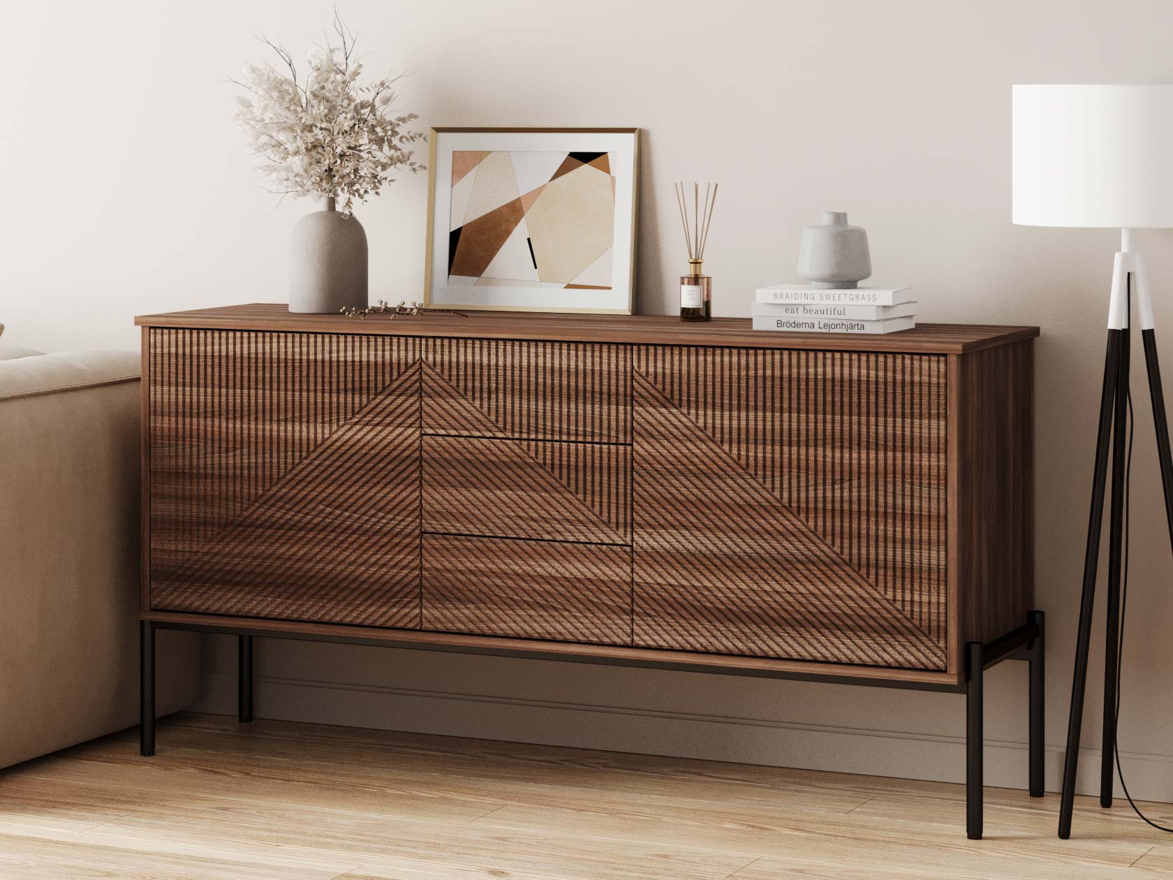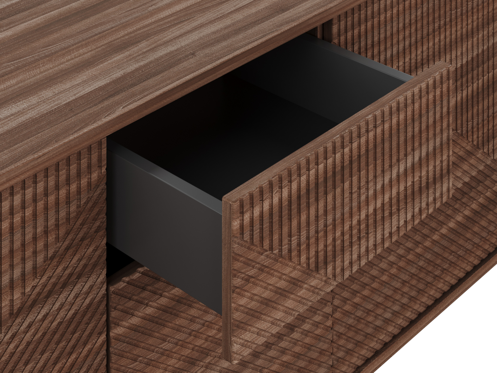 Комод Азуми 3 ящ 2 дв — прекрасный способ упорядочить хранение вещей и разнообразить интерьер. Фрезеровка на фасадах выполнена в виде геометрического узора. Такой дизайн актуален и очень привлекателен. Благодаря высоким опорам комод смотрится невесомо и подходит даже для небольшой комнаты.