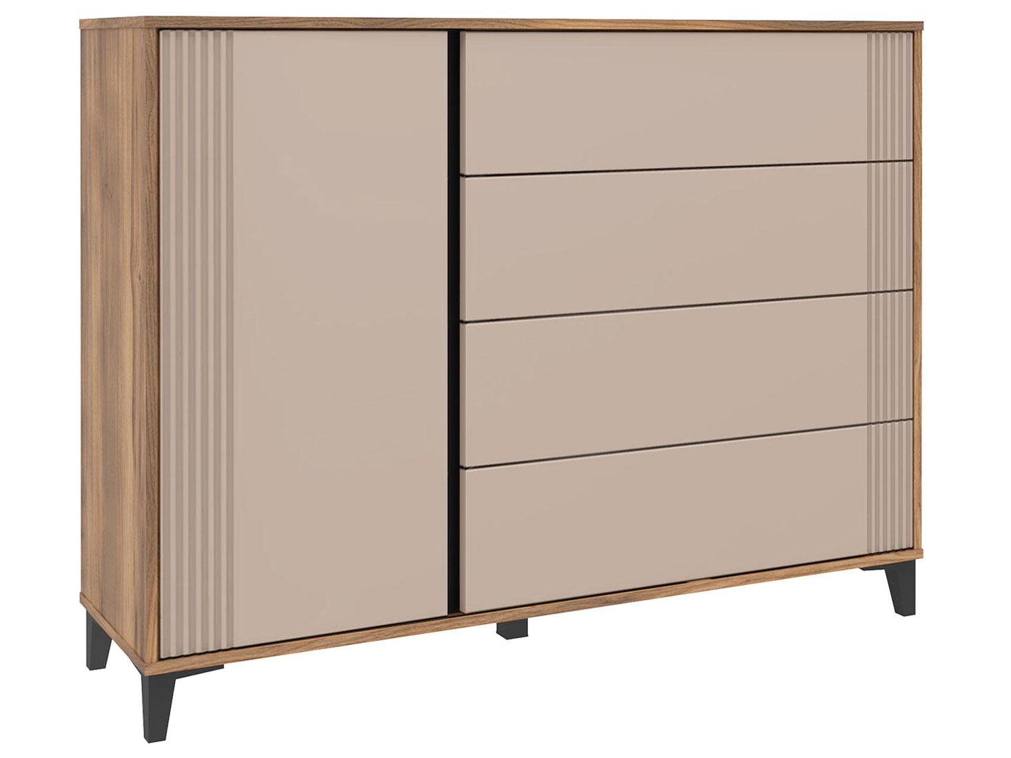 Комод Богемия создаст удобную систему хранения, где легко найти любую нужную вещь. Выдвижные ящики с плавным ходом открывают полный обзор содержимого. Изюминка модели — вертикальные линии на фасадах. С ними комод выглядит очень стильно и актуально.
