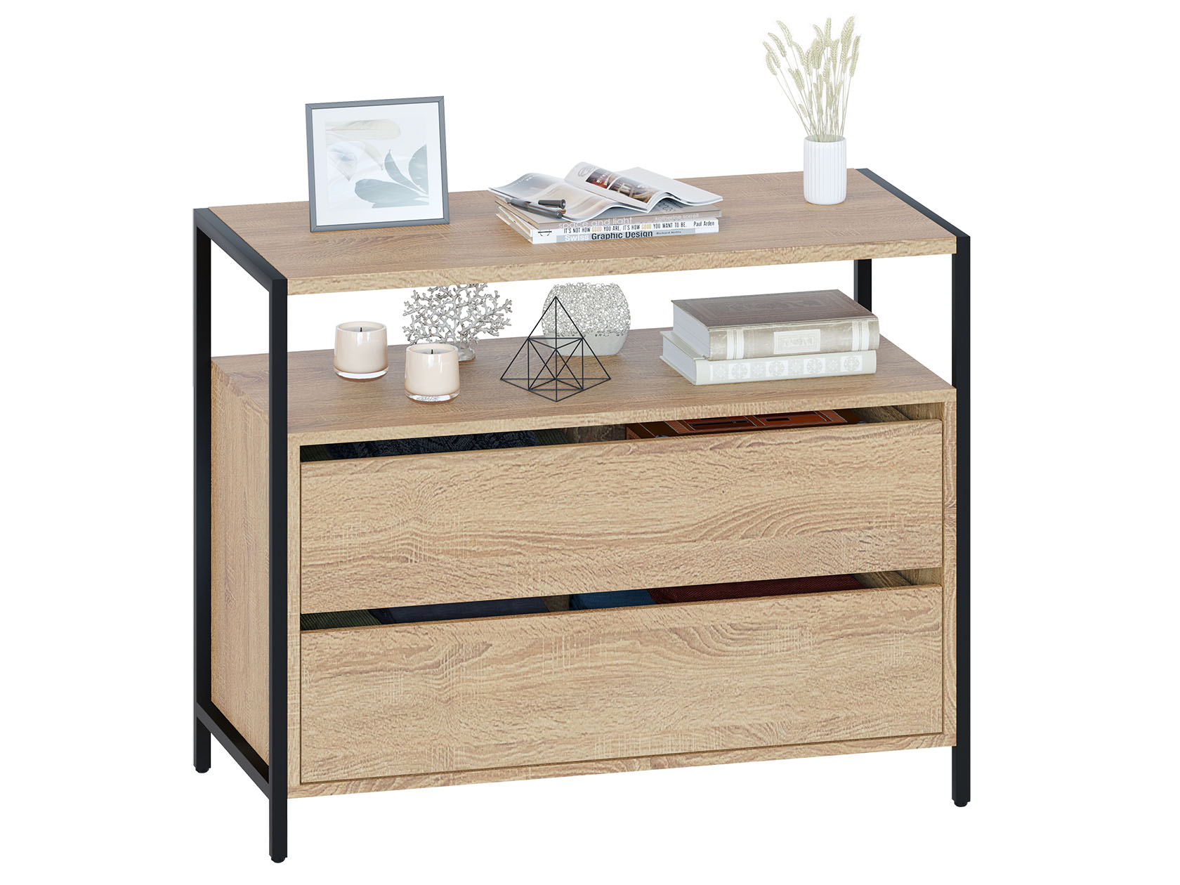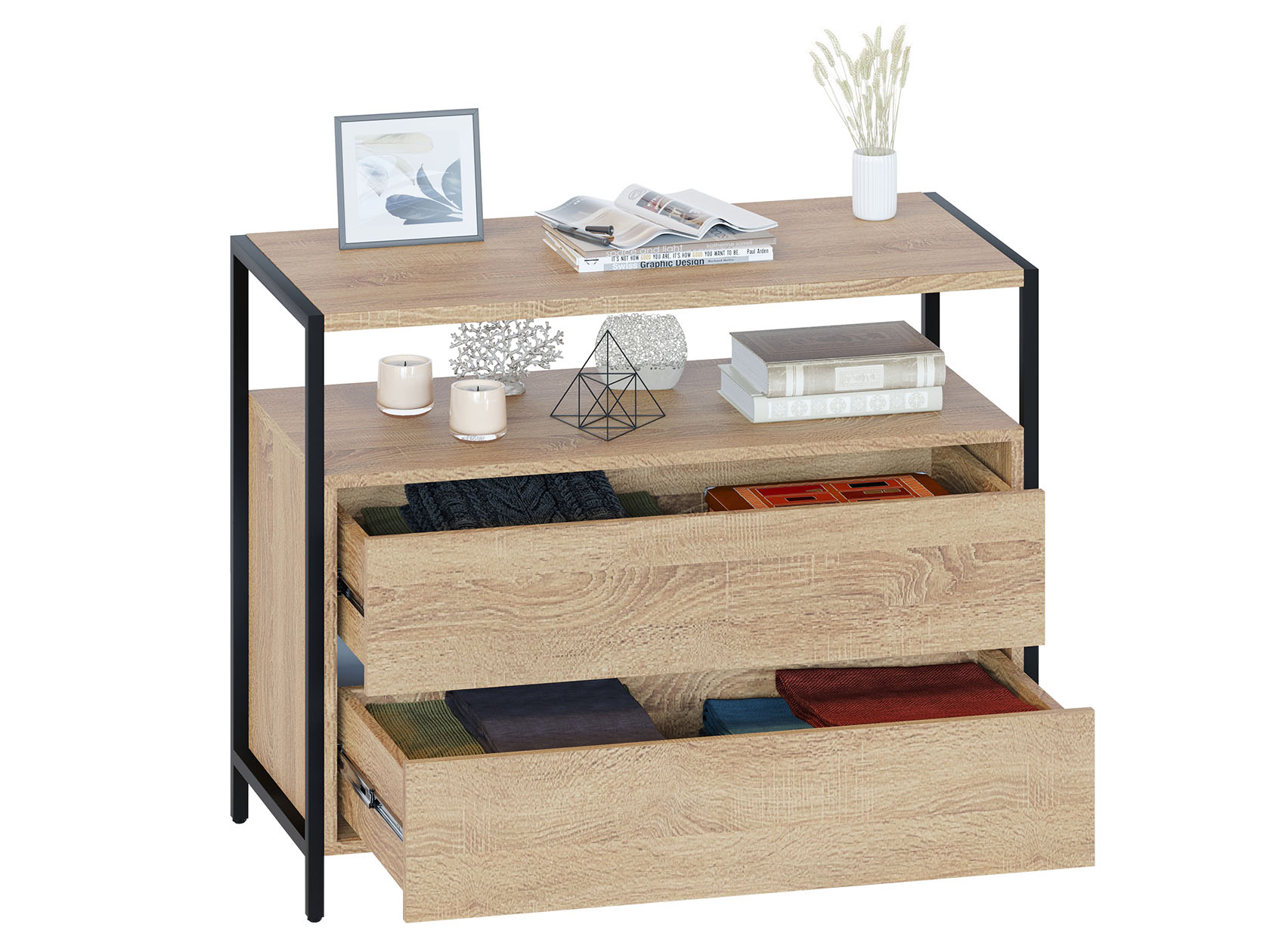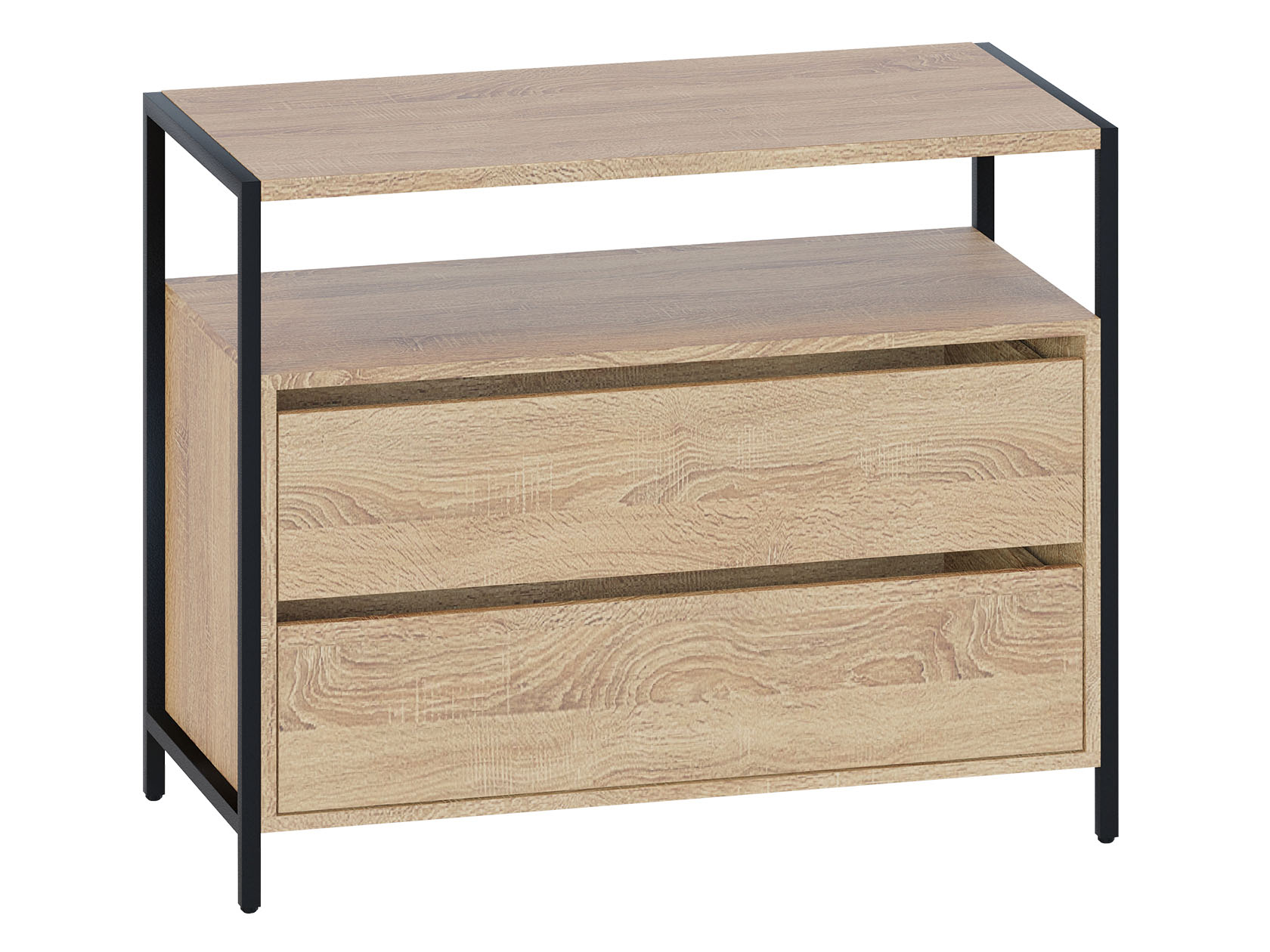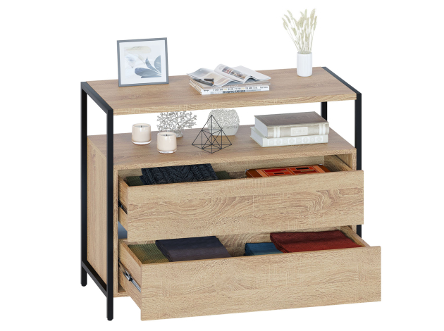 Комод Джаз станет важной частью меблировки современной комнаты или офисного пространства. В выдвижных ящиках удобно хранить документы, личные вещи и аксессуары. Отличительная особенность модели — отсутствие ручек, вместо которых между фасадами предусмотрены специальные вырезы. Металлические опоры придают комоду стильный вид.