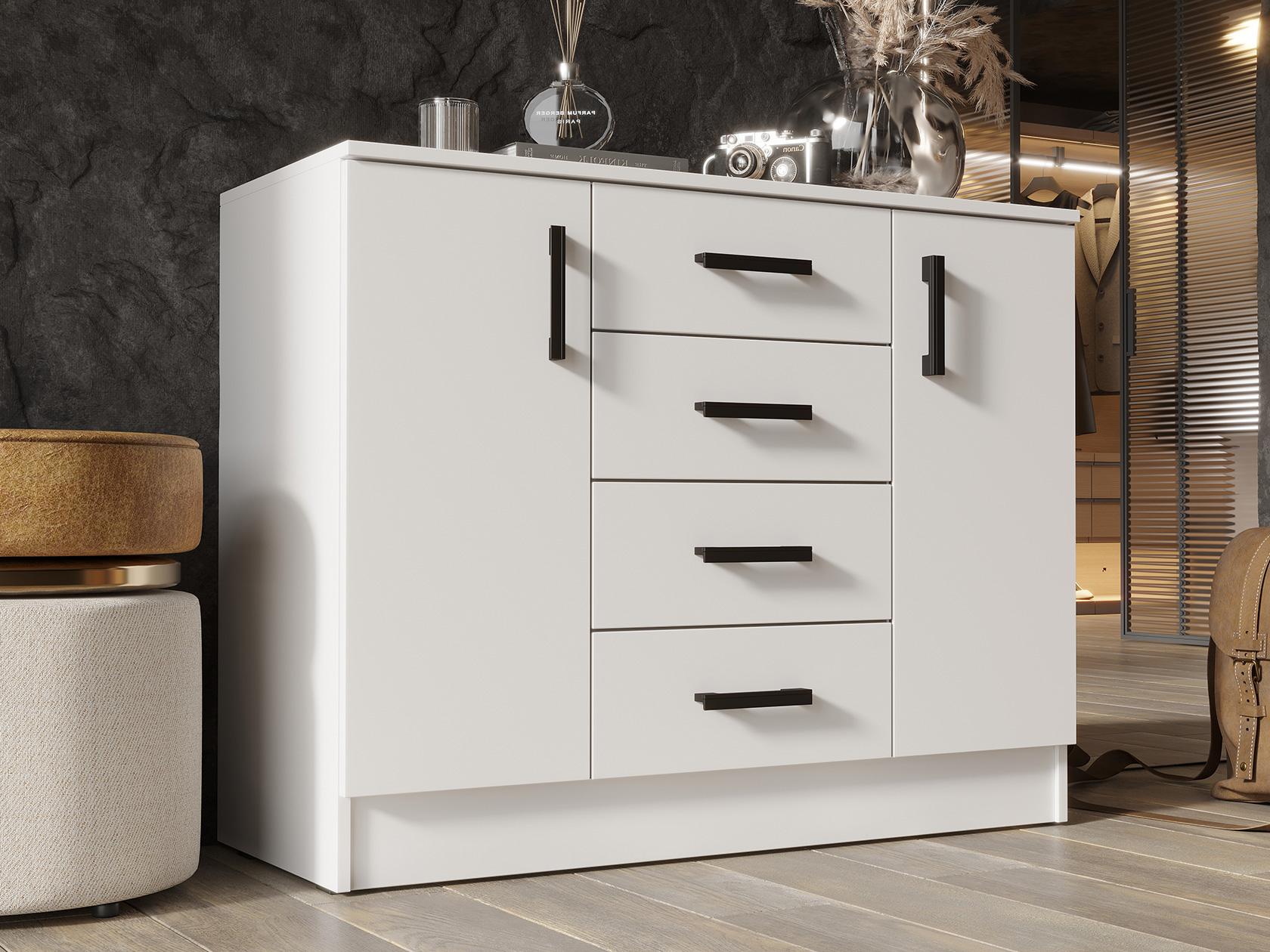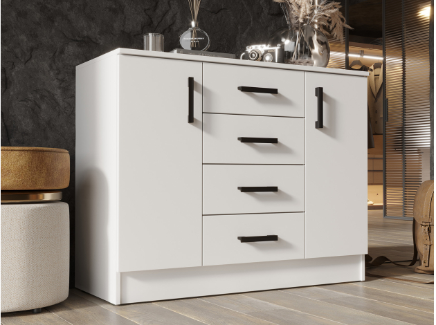 Комод Эко 3 станет отличным дополнением современного интерьера и позволит распределить большое количество вещей. Выдвижные ящики удобны для хранения мелочей, а боковые секции обеспечивают место для более крупных предметов. Простые линии в сочетании с лаконичной фурнитурой придают модели универсальный вид, подходящий для разных стилей меблировки.