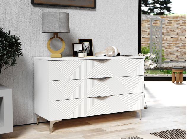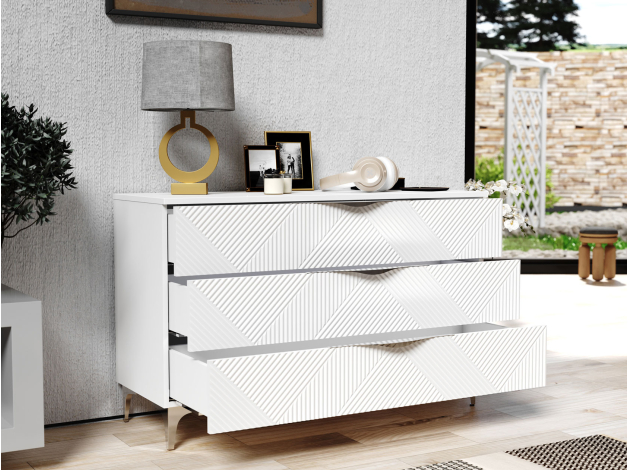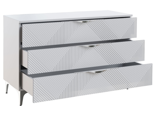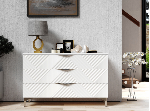 Комод Эстел — просторная модель для хранения различных вещей в спальне, гостиной или прихожей. Выдвижные ящики обеспечивают удобное размещение одежды, аксессуаров и других необходимых предметов. Оригинальная фрезеровка и металлическая фурнитура дарят комоду особый шарм и уникальный внешний вид.