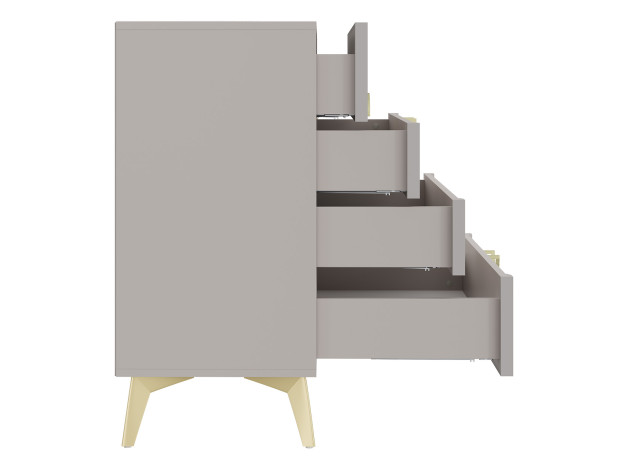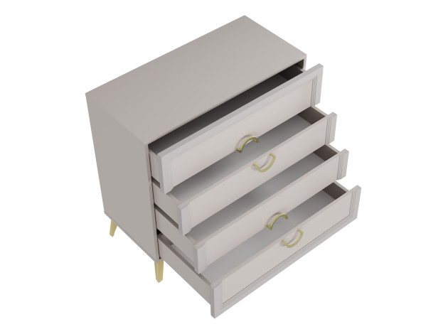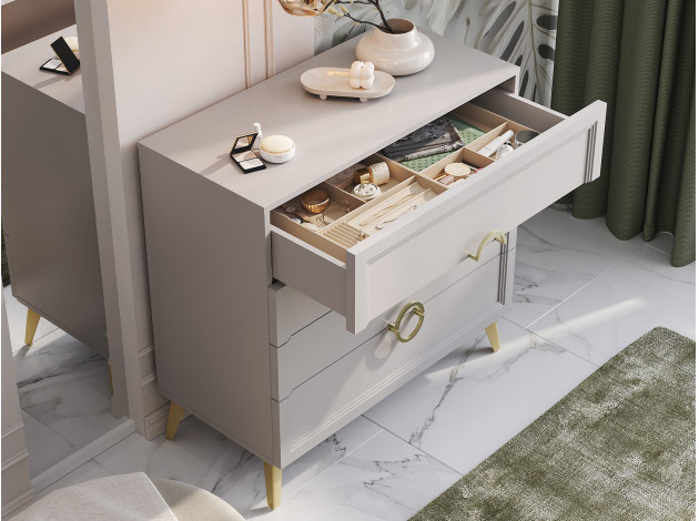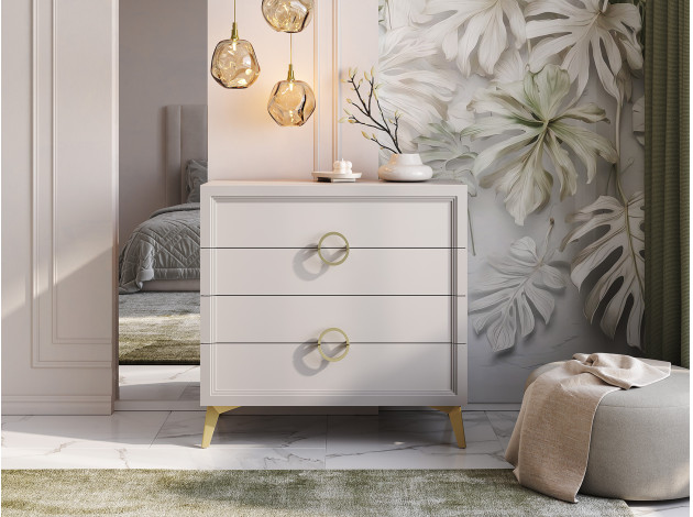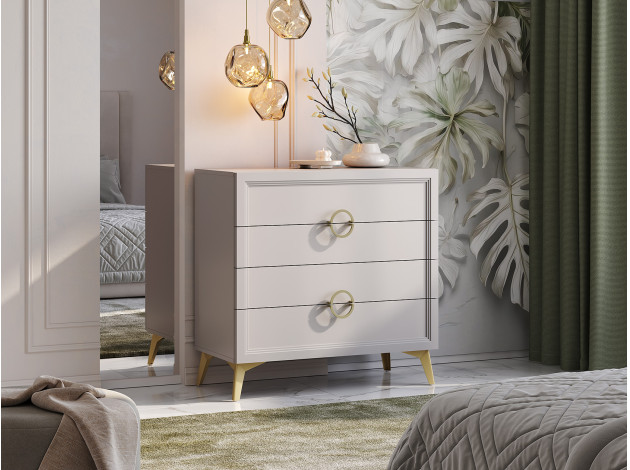 Комод Эстетика украсит любую комнату и создаст дополнительное место для хранения различных вещей. Выдвижные ящики позволяют аккуратно распределить белье, аксессуары и другие предметы обихода. Благодаря декору в виде вертикальных линий и ручкам в золотом оттенке модель смотрится очень привлекательно и элегантно. Высокие ножки придают мебели легкость и изящество.