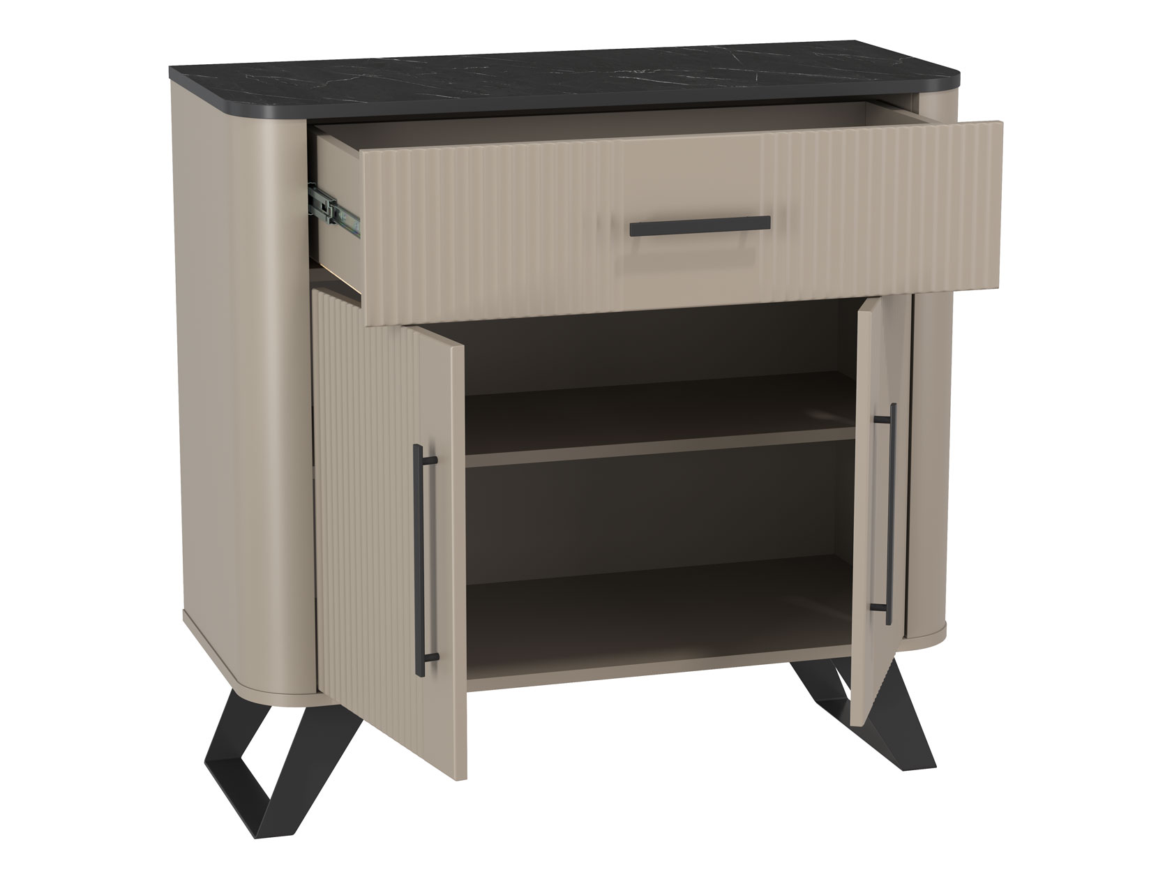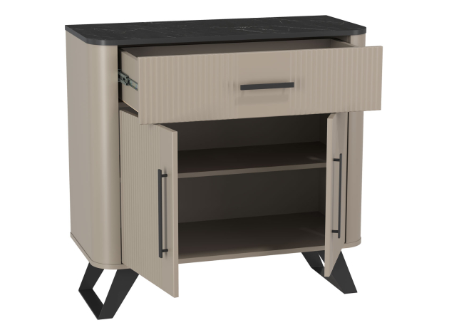 Комод Фиделия Мини поможет поддерживать порядок даже в небольшой комнате. Компактная модель удачно дополнит пространство прихожей, гостиной или спальни. Выдвижной ящик обеспечит быстрый доступ к мелочам и полный обзор содержимого. За распашными дверцами находится отделение с полкой, где поместятся коробки, текстиль и прочие предметы обихода. Высокие опоры создают визуально легкий силуэт и упрощают уборку. Параллельные линии фрезеровки и ручки-скобы создают сдержанный и одновременно элегантный облик мебели.