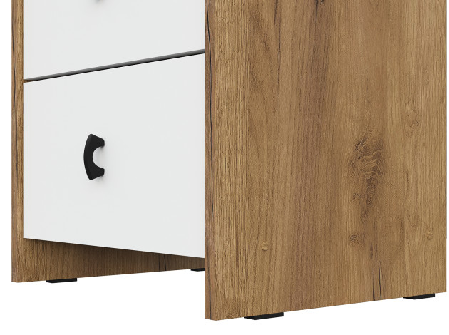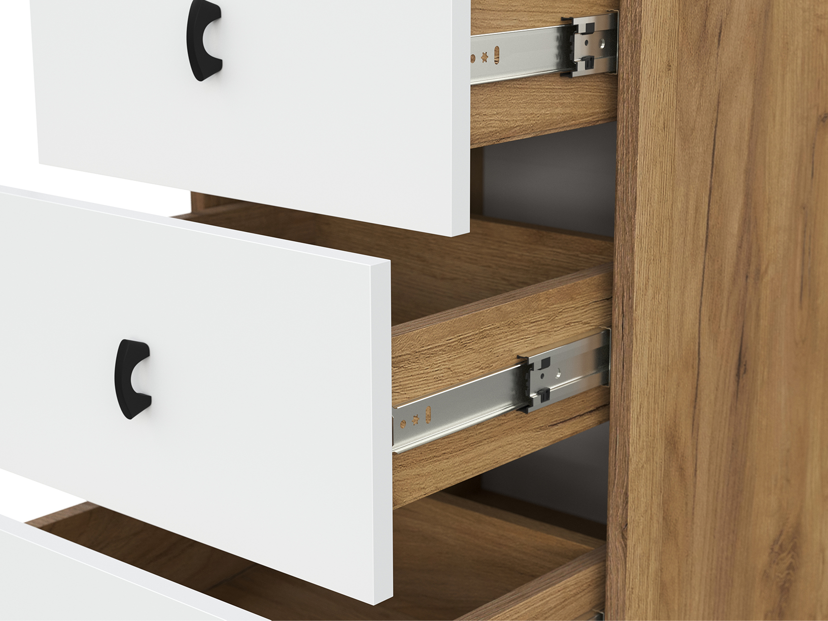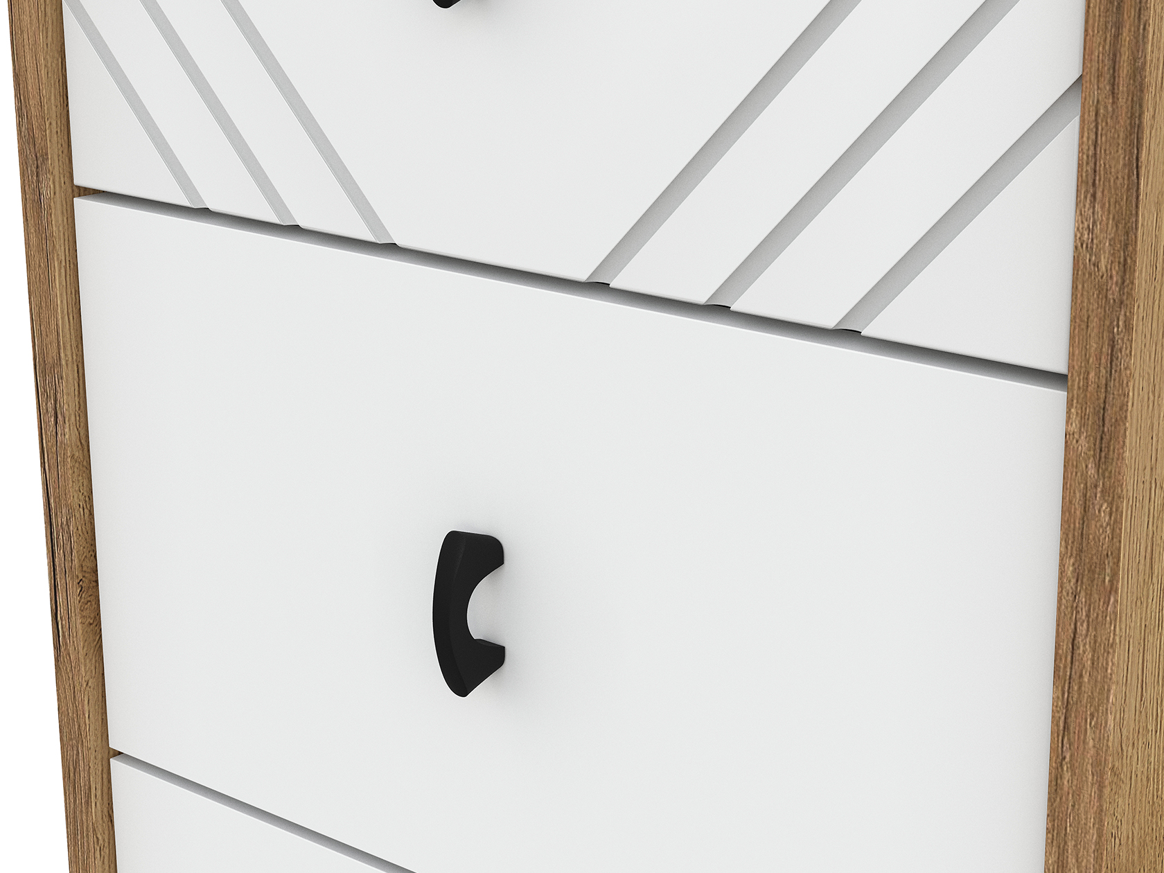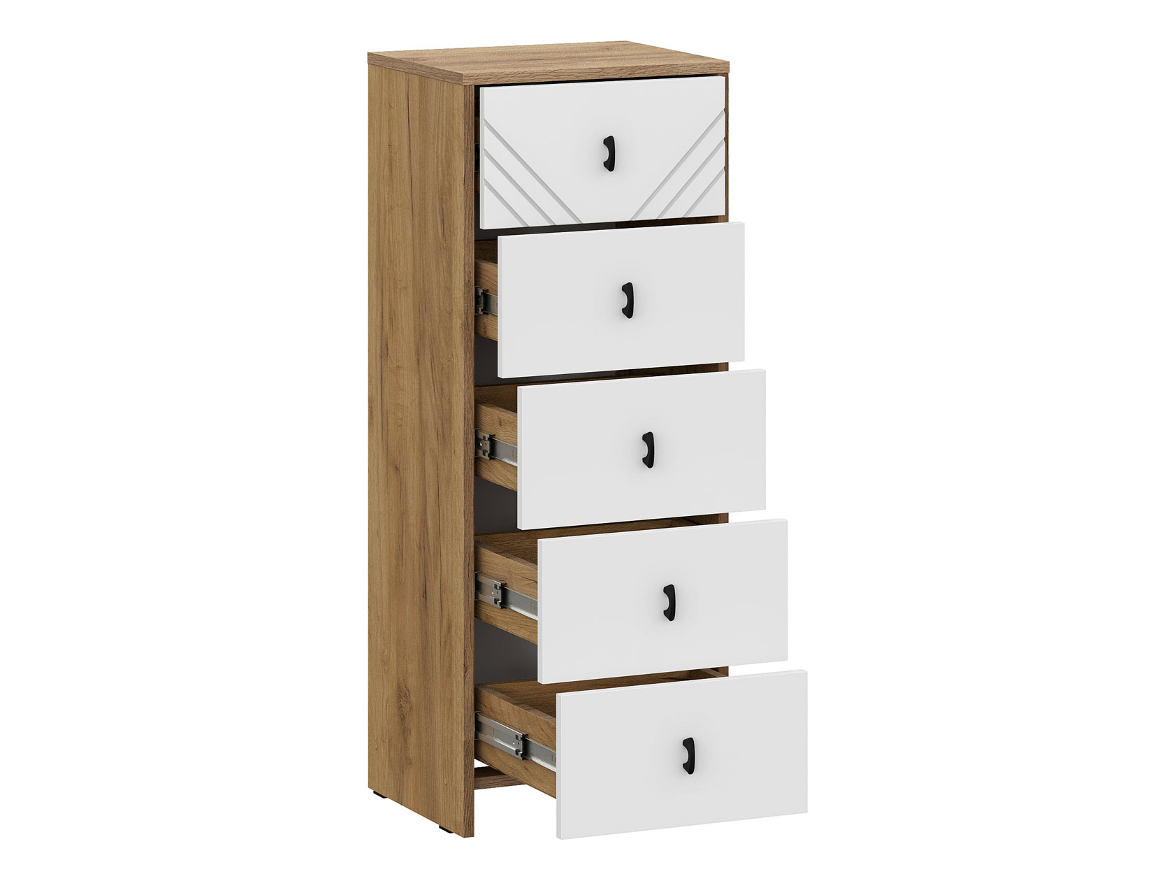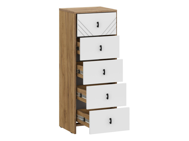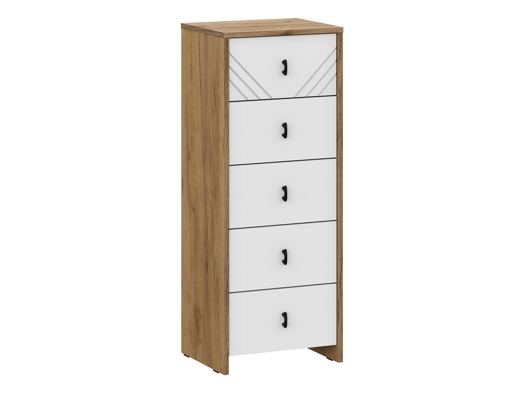 Комод Кайло станет стильным акцентом интерьера любой комнаты. Высокая модель с пятью выдвижными ящиками идеально подойдет для небольшого пространства. Верхний фасад украшен фрезеровкой. Лаконичные ручки подчеркивают современный дизайн мебели. Древесная текстура добавляет обстановке нотки теплоты и уюта.