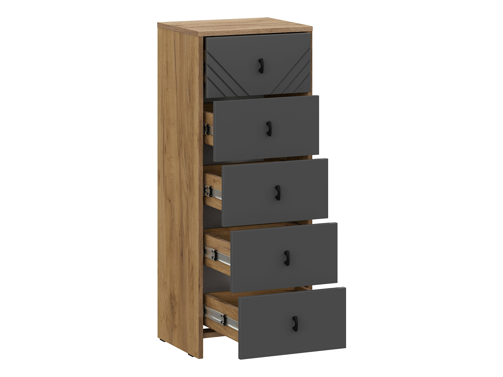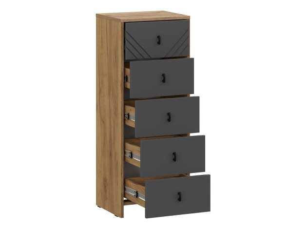 Комод Кайло станет стильным акцентом интерьера любой комнаты. Высокая модель с пятью выдвижными ящиками идеально подойдет для небольшого пространства. Верхний фасад украшен фрезеровкой. Лаконичные ручки подчеркивают современный дизайн мебели. Древесная текстура добавляет обстановке нотки теплоты и уюта.