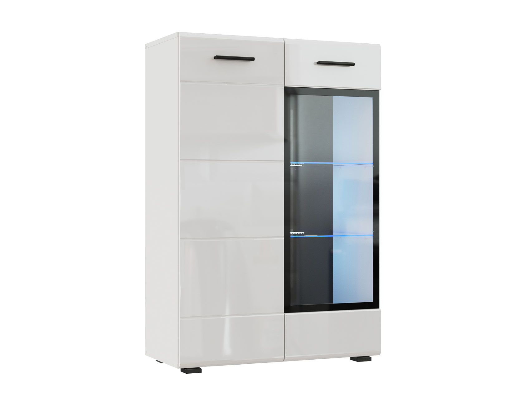Комод Глосс — стильное решение для меблировки современной гостиной. Глянцевые фасады гармонично сочетаются с минималистичными черными ручками. На вместительных полках найдется место для хранения книг, документов или предметов декора. Особую привлекательность придает модели стеклянная вставка с акцентным черным кантом по периметру.