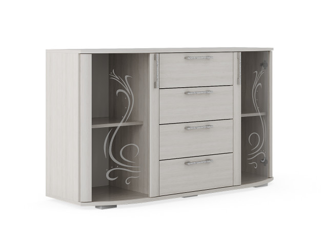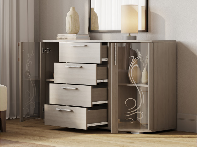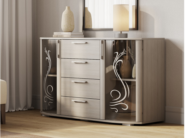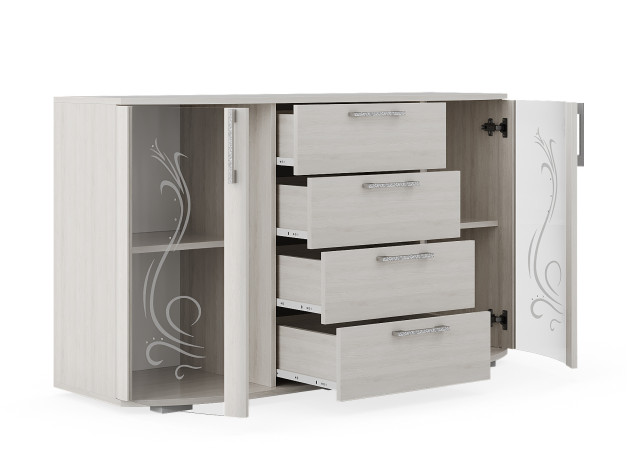 Комод Грация — настоящий идеал изящества и утонченности. Внешний вид модели пленяет, а богатое внутренне наполнение превращает в эталон функциональности. Фасады представляют собой чудесный тандем стеклянных и деревянных элементов. Центральная часть отведена под выдвижные ящики с удобными ручками. По бокам изысканно разместились распашные шкафчики с тонированными дверцами, украшенные витиеватыми узорами и стразами.