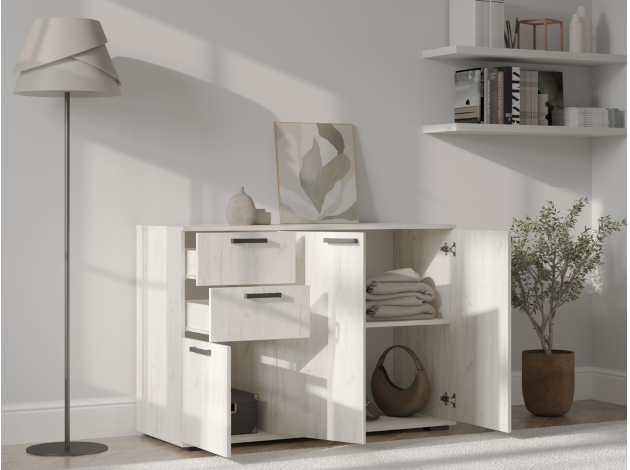 Комод Стандарт 3 — удачное решение для меблировки. Выдвижные ящики помогут аккуратно расположить разные мелочи, а за дверцами поместятся более объемные предметы гардероба, документы или детские игрушки. Уютный дизайн в приятных древесных оттенках легко интегрировать в современные интерьерные стили.