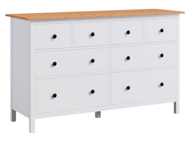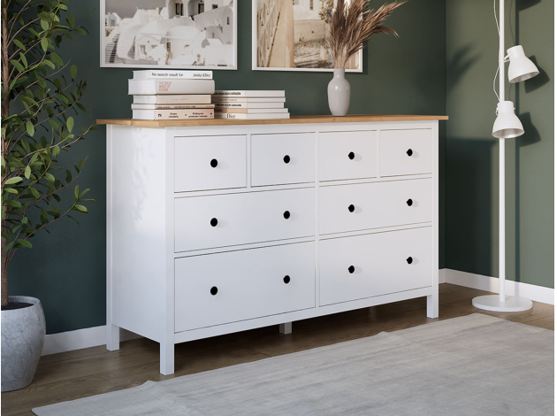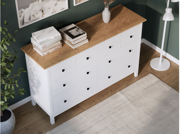 Комод Кымор из экологичного массива дерева подойдет для меблировки любой комнаты. Разные по размеру ящики организуют удобную систему хранения. Столешница выдерживает большую нагрузку, поэтому комод можно использовать в качестве тумбы под телевизор.
