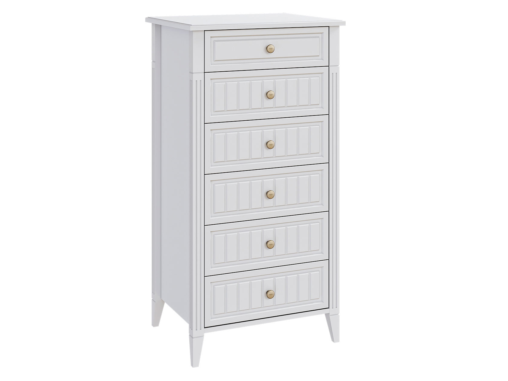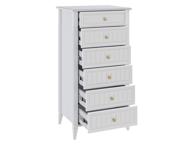 Комод Леона отличается изящным дизайном и вместительностью. Высокая конструкция с выдвижными ящиками гармонично впишется в интерьер. Шариковые направляющие позволяют ящикам выдвигаться на полную глубину. Рамочные фасады дополнены фрезеровкой и лаконичными ручками, а невысокие опоры создают акценты меблировки.