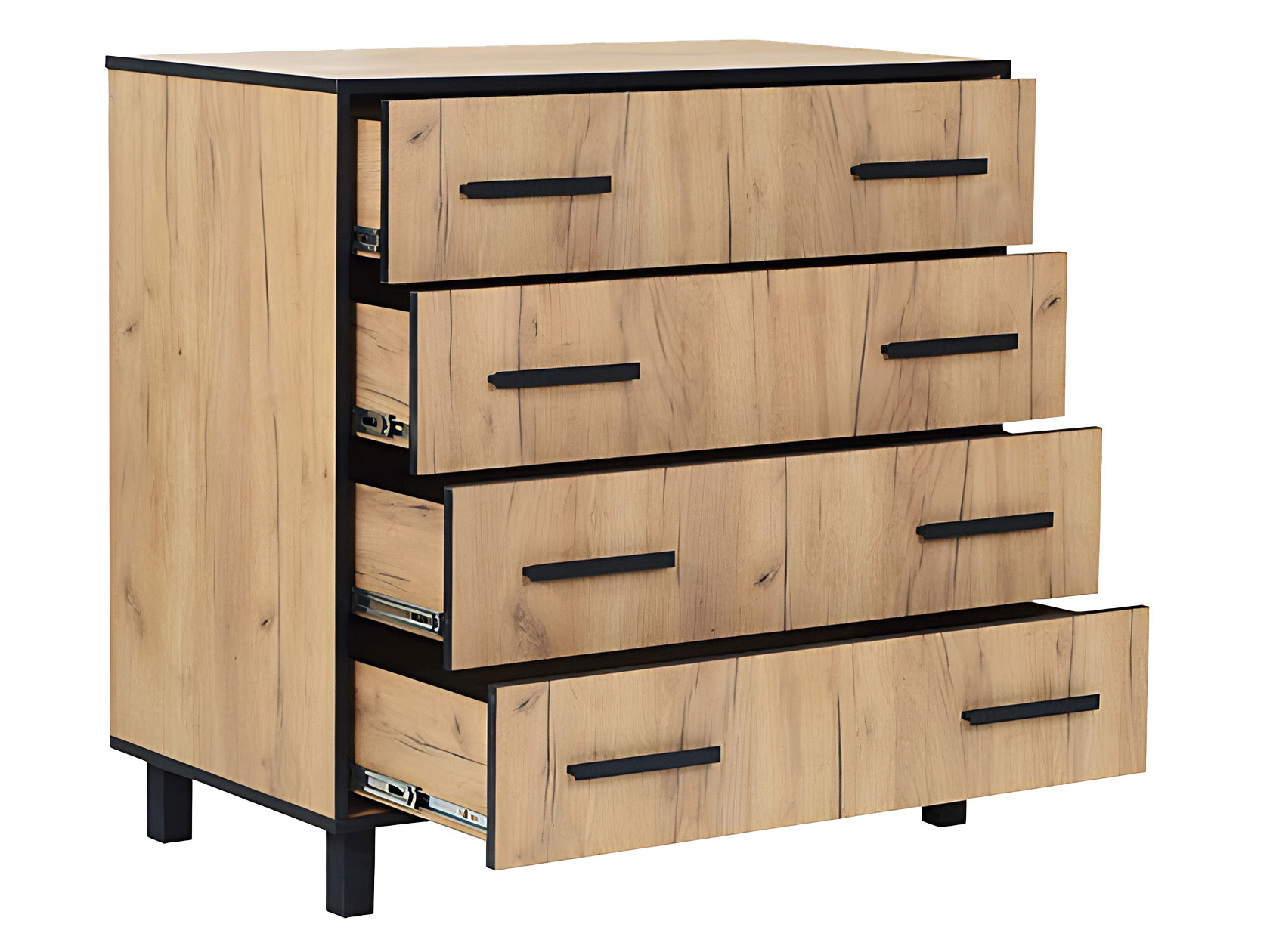 Комод Лофт станет практичным дополнением интерьера прихожей. Просторные выдвижные ящики позволяют грамотно распределить вещи по категориям. Контрастная рамка в цвет фурнитуры в оформлении фасадов придает мебели интересный акцент.
