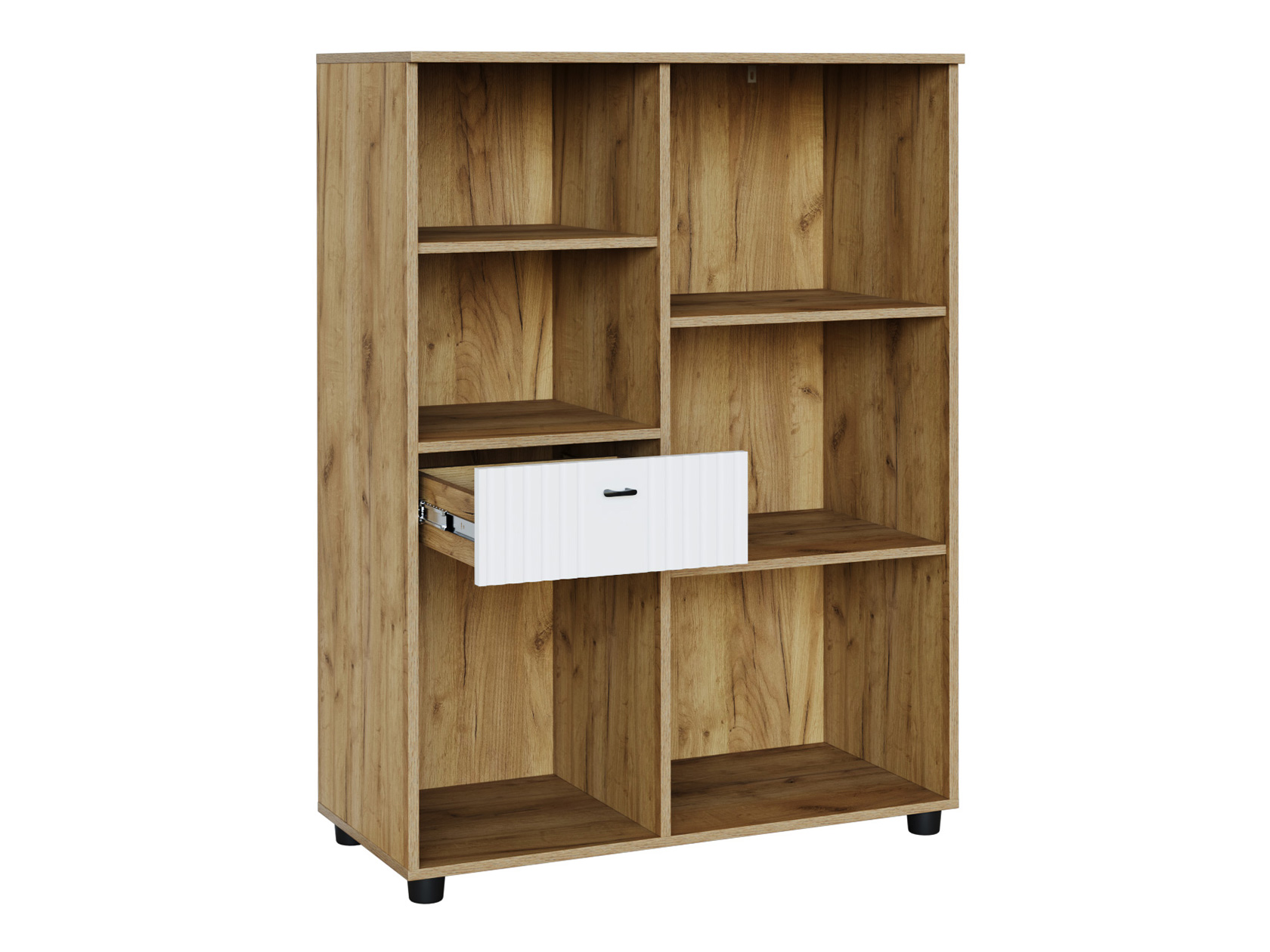 Комод Милан станет функциональным дополнением современного интерьера. Система хранения представлена вместительными полками за распашными дверцами и небольшим выдвижным ящиком для быстрого доступа к полезным мелочам. Открытые ниши позволят оживить обстановку предметами декора и комнатными растениями. Фасады выполнены из качественного экологичного материала и украшены вертикальной фрезеровкой.