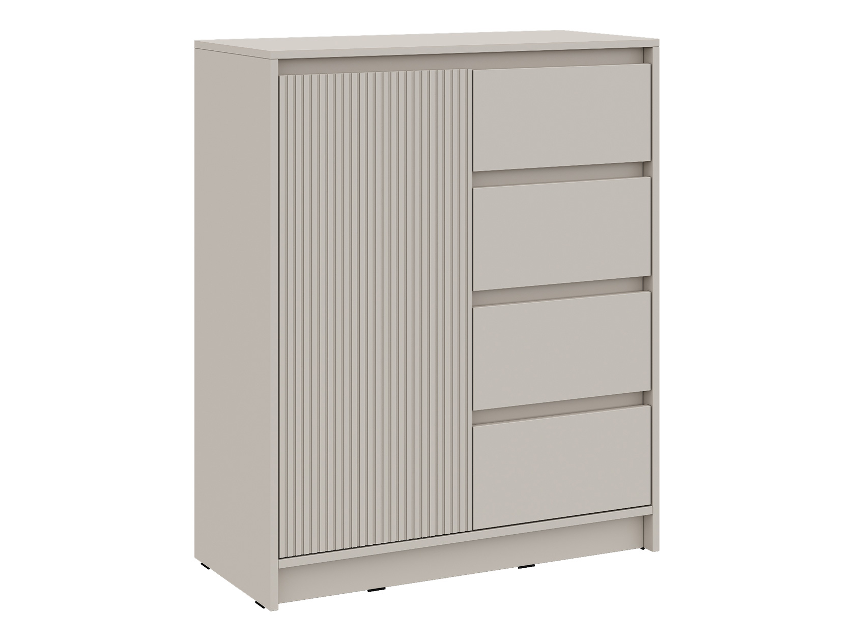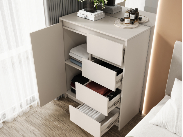Комод Мирен станет незаменимым помощником в хранении. Комбинированное наполнение позволяет распределить вещи по категориям. Ящики выдвигаются на полную глубину, обеспечивая быстрый доступ к содержимому. Отделение с распашной дверцей разместит коробки, книги и другие объемные предметы. Рельефный фасад с волнообразной фрезеровкой создает стильный и динамичный образ модели.