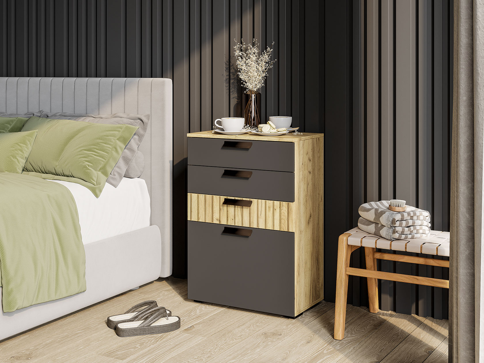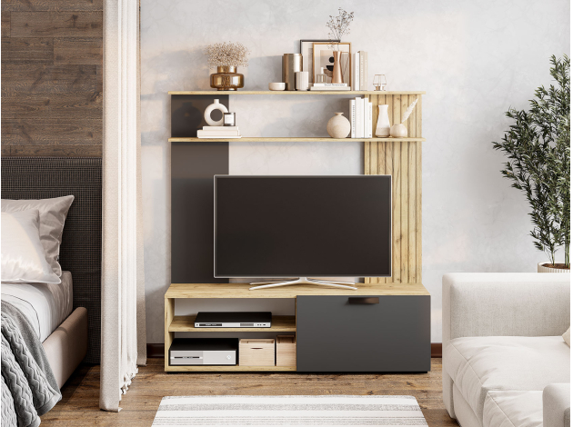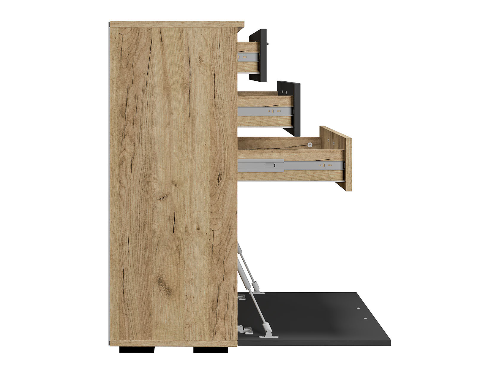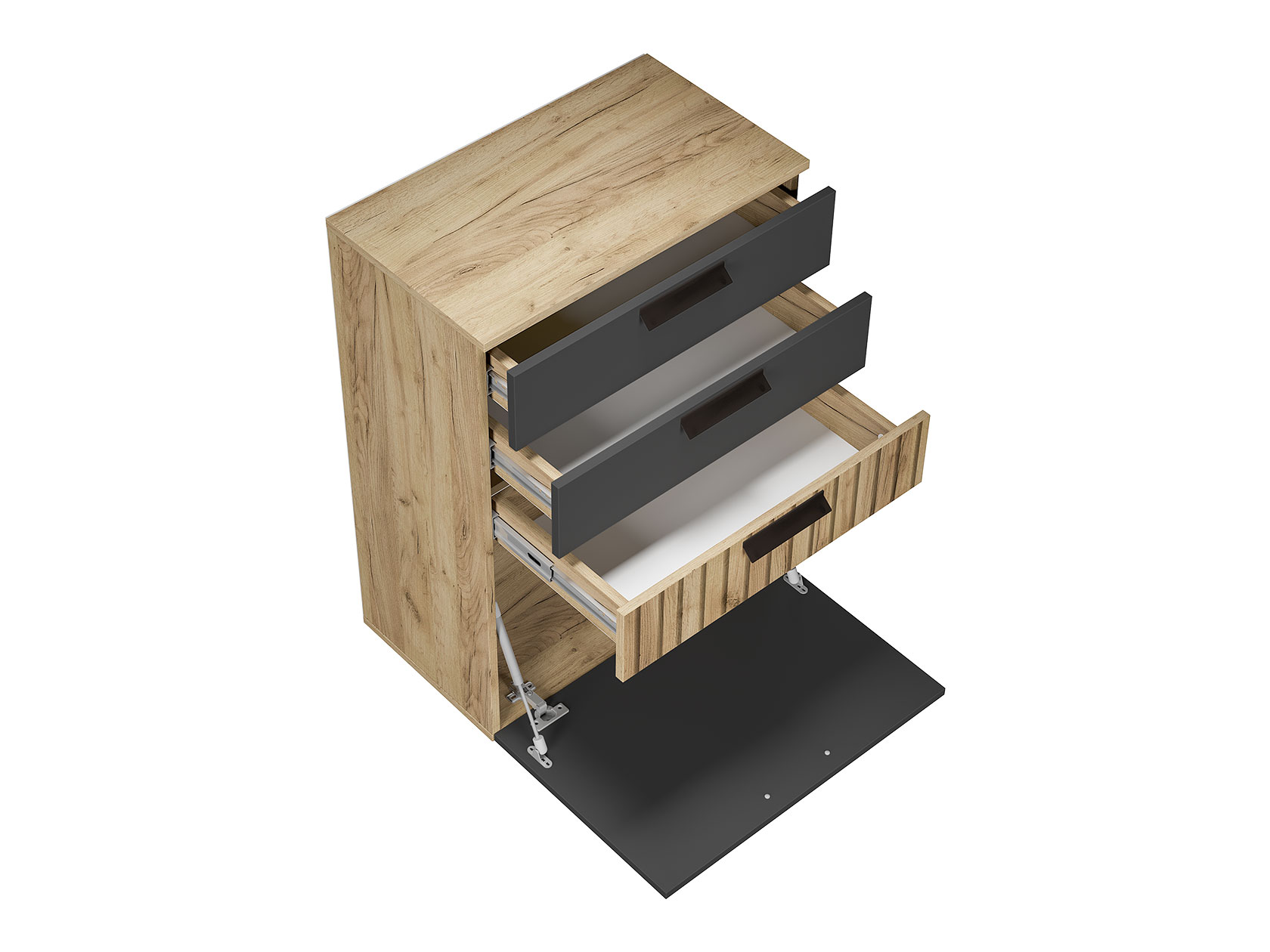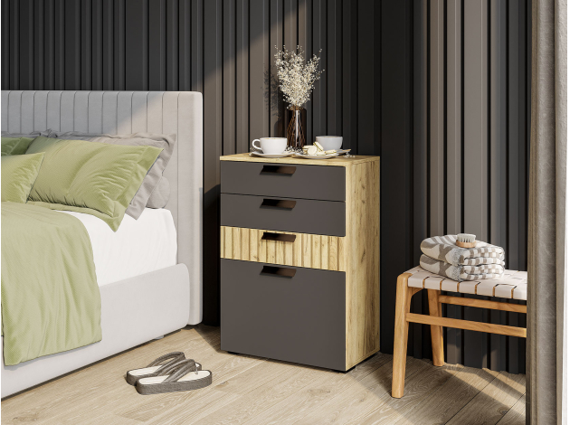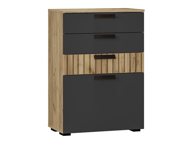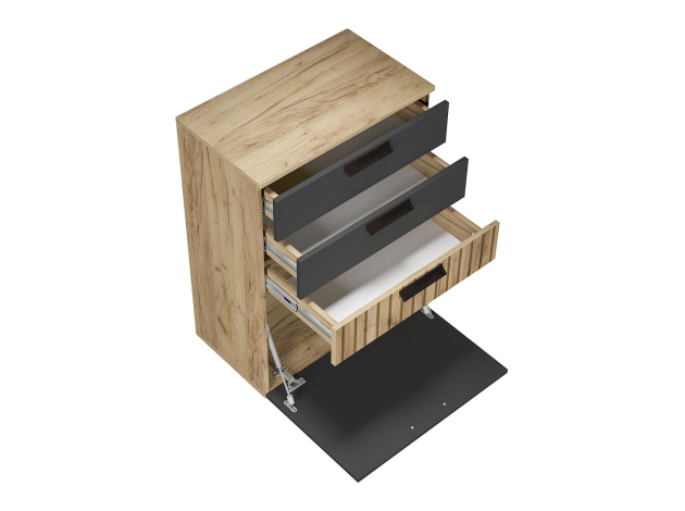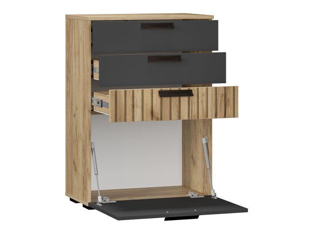 Комод Мишель станет незаменимой частью упорядоченного интерьера. В дизайне гармонично сочетаются матовые фасады и текстура дерева. Выдвижные ящики подходят для хранения различных мелочей, а за откидной дверцей можно спрятать коробки и другие крупные предметы.