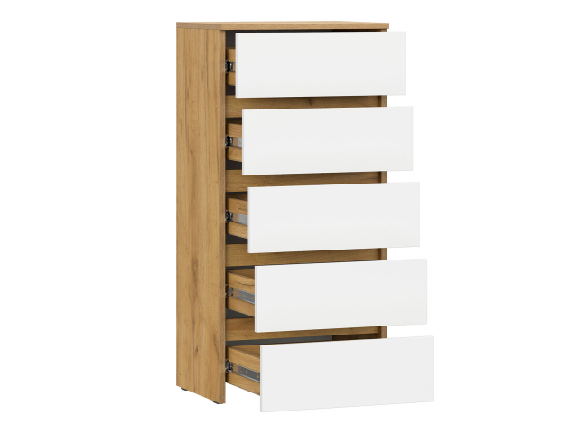 Комод Некст 5 ящиков идеально поместится в ограниченном пространстве и организует удобное хранение необходимых вещей. Высокая конструкция оснащена пятью ящиками, которые при нажатии на фасад плавно выдвигаются на полную глубину. Такое решение позволяет отказаться от выступающей фурнитуры в отделке мебели.
