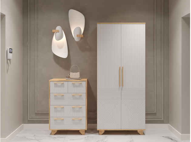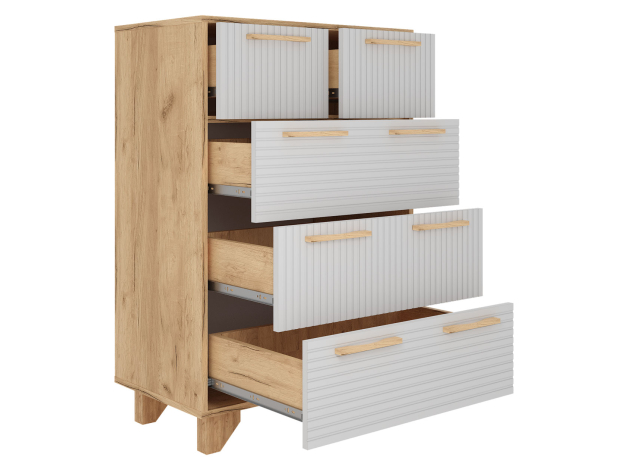 Комод Ньерд с ящиками позволяет удобно хранить одежду, белье, аксессуары и важные мелочи. Выдвижные ящики открываются на полную глубину и обеспечивают быстрый доступ к содержимому. Древесная текстура, фасады с необычной фрезеровкой и акцентные ножки создают особый облик мебели, который органично дополняет интерьеры в скандинавском или эко-стиле.