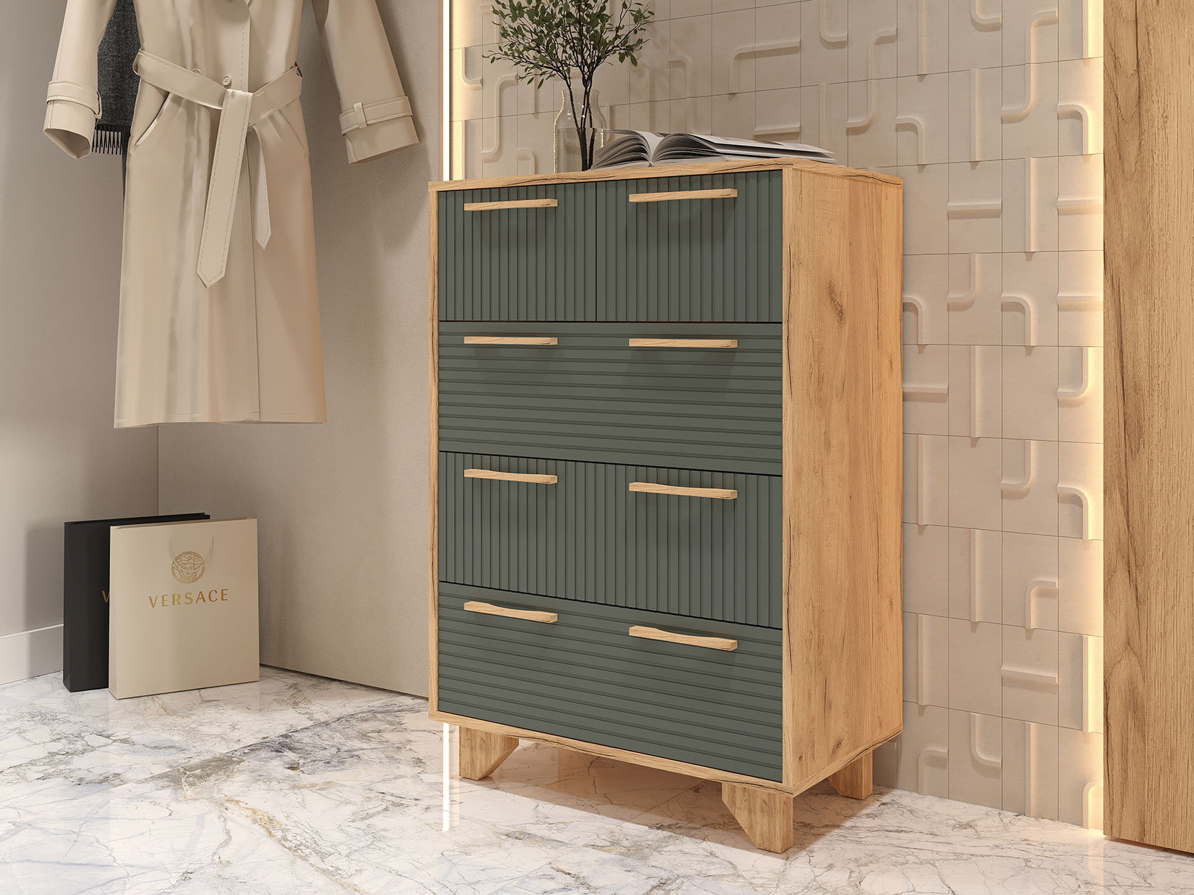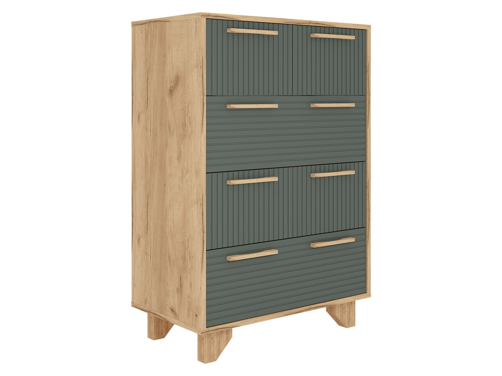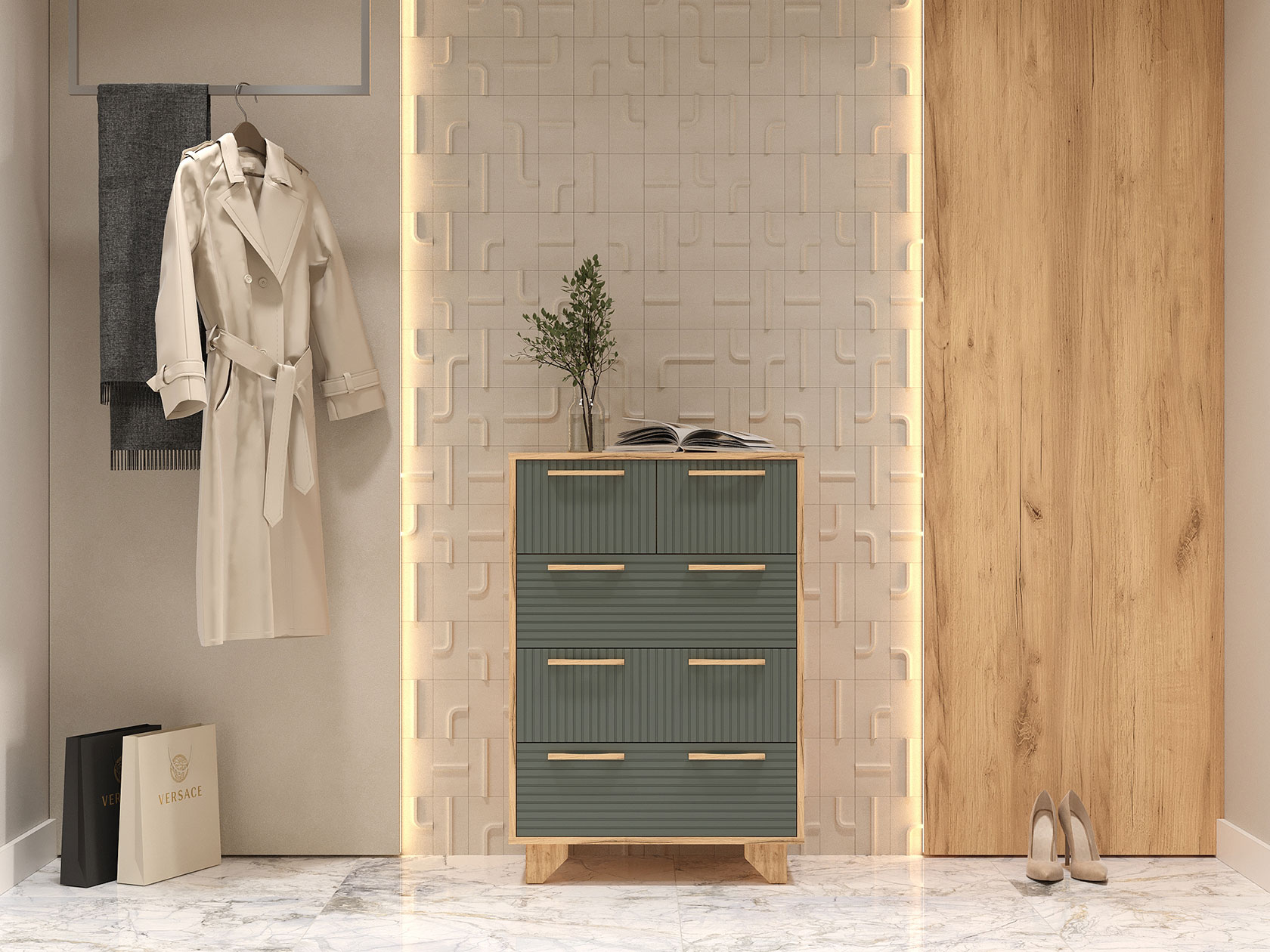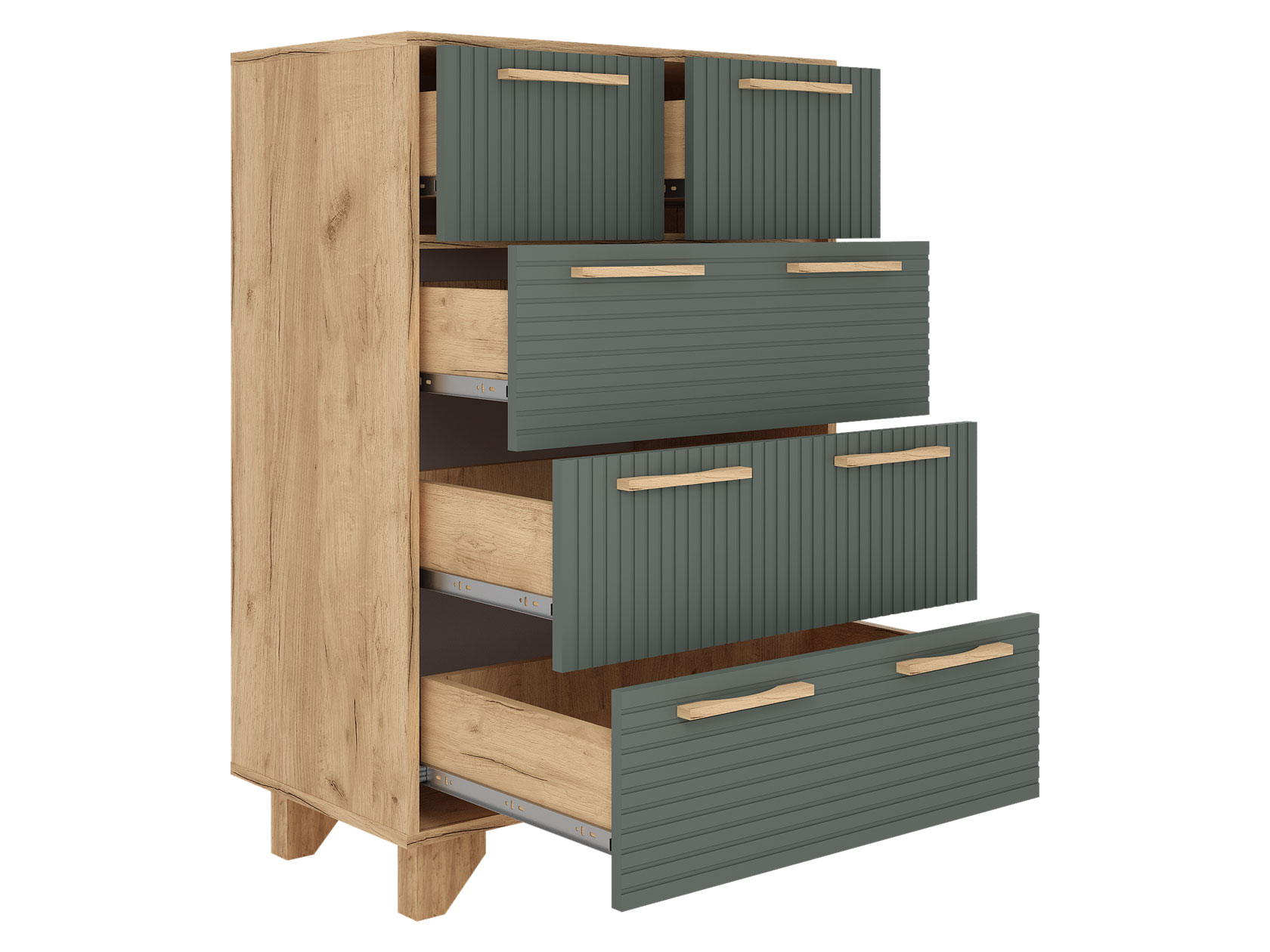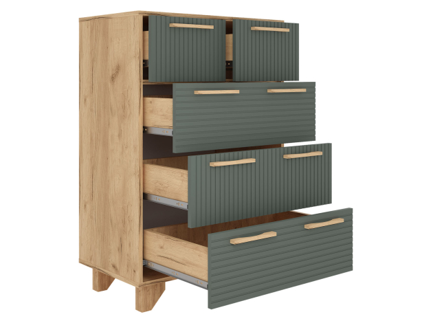 Комод Ньерд с ящиками позволяет удобно хранить одежду, белье, аксессуары и важные мелочи. Выдвижные ящики открываются на полную глубину и обеспечивают быстрый доступ к содержимому. Древесная текстура, фасады с необычной фрезеровкой и акцентные ножки создают особый облик мебели, который органично дополняет интерьеры в скандинавском или эко-стиле.