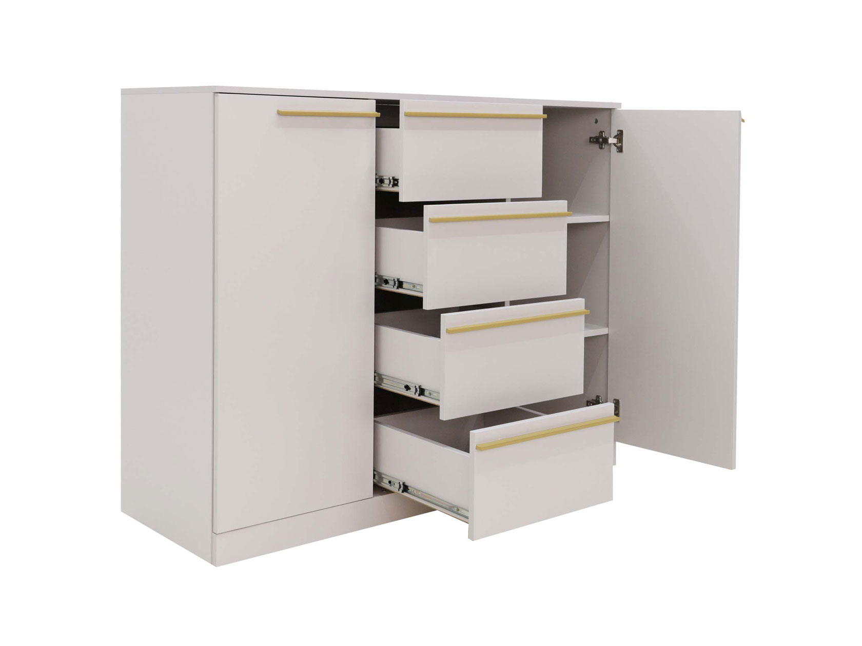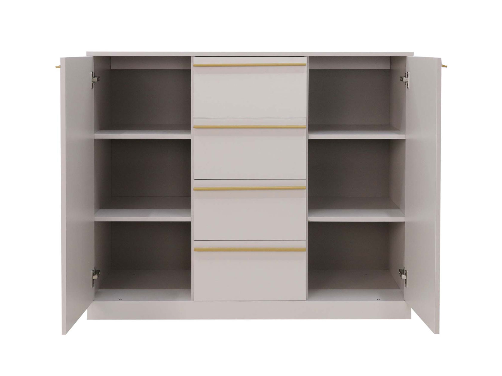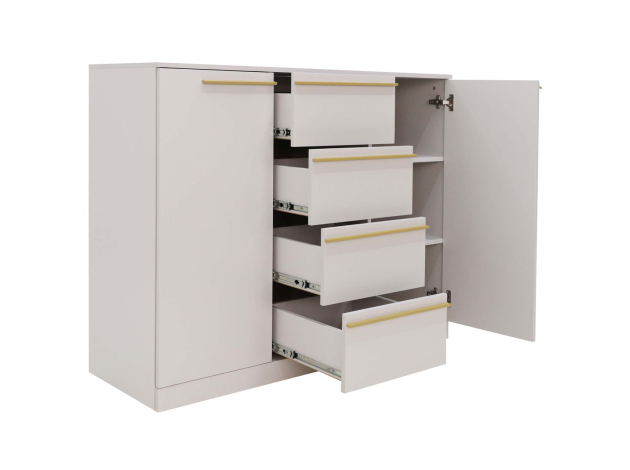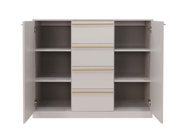 Комод Николь украсит интерьер, сделав обстановку более функциональной и эстетичной. Выдвижные ящики и распашные секции позволяют оптимально распределить содержимое и легко находить нужную вещь. Изысканный силуэт модели подчеркивают строгие линии и тонкие ручки в благородном оттенке сатинового золота. На поверхности можно разместить предметы декора, комнатные растения или настольную лампу.