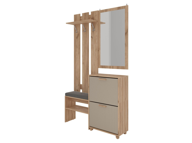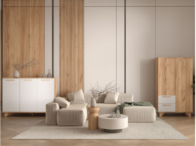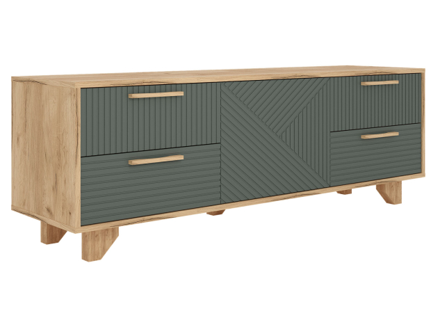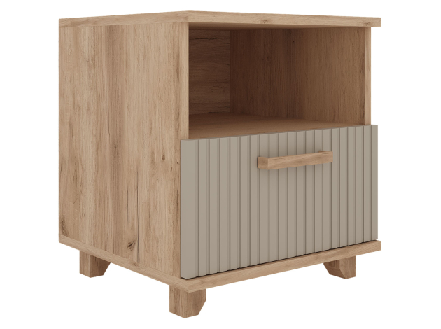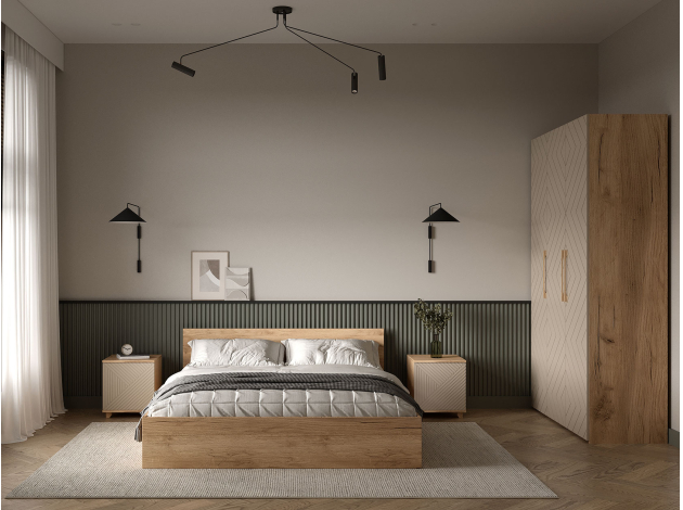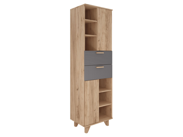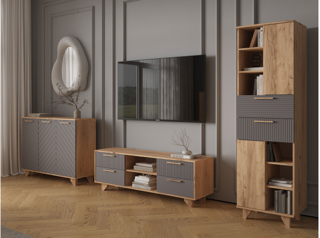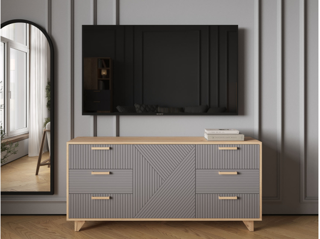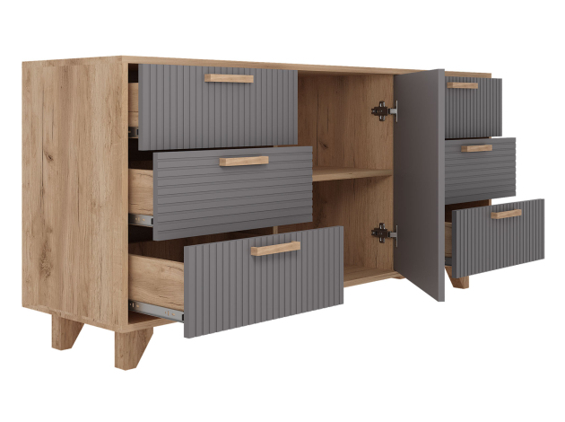 Комод Ньерд позволяет удобно хранить различные предметы: одежду, белье, аксессуары и важные мелочи. Выдвижные ящики обеспечивают быстрый доступ к содержимому. Древесная текстура, фасады с необычной фрезеровкой и акцентные ножки создают атмосферу уюта и тепла.