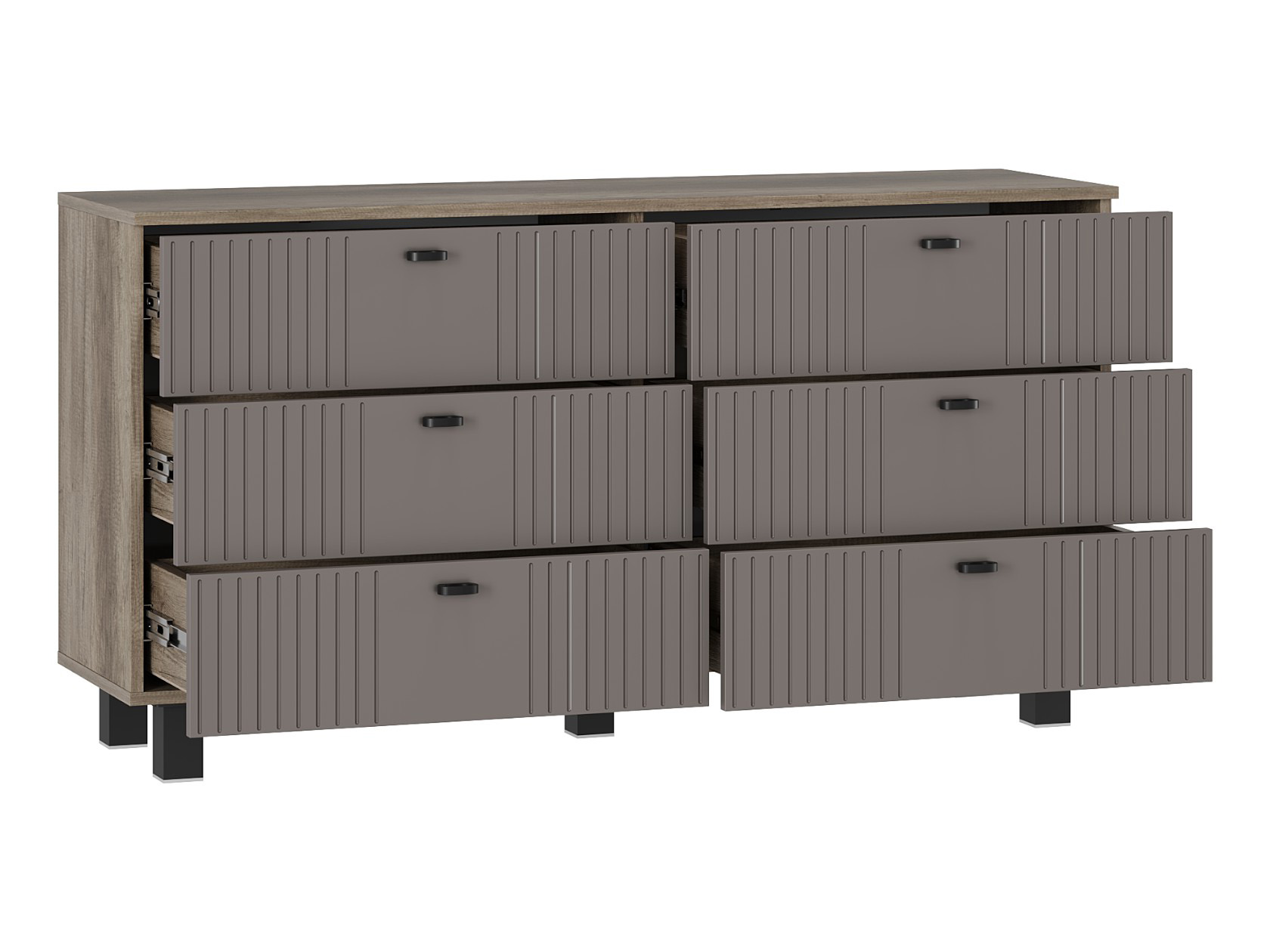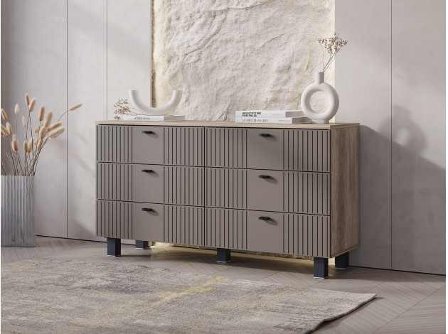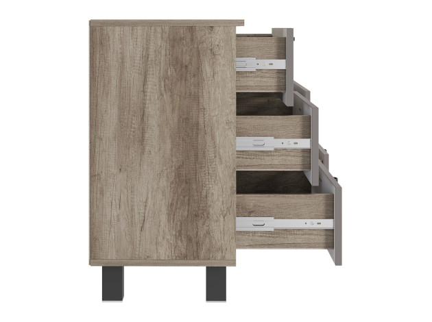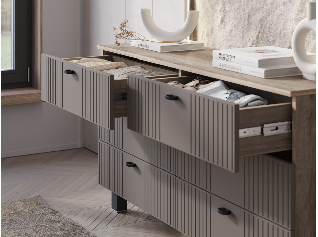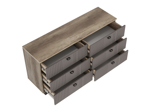 Комод Олива оснащен выдвижными ящиками небольшой глубины. Модель идеально подходит для узкой комнаты или прихожей. Матовые фасады с фрезеровкой гармонично дополняют корпус в древесном декоре. Внутри удобно хранить одежду, важные документы, бытовые мелочи и другие вещи, которые не хочется оставлять на виду.