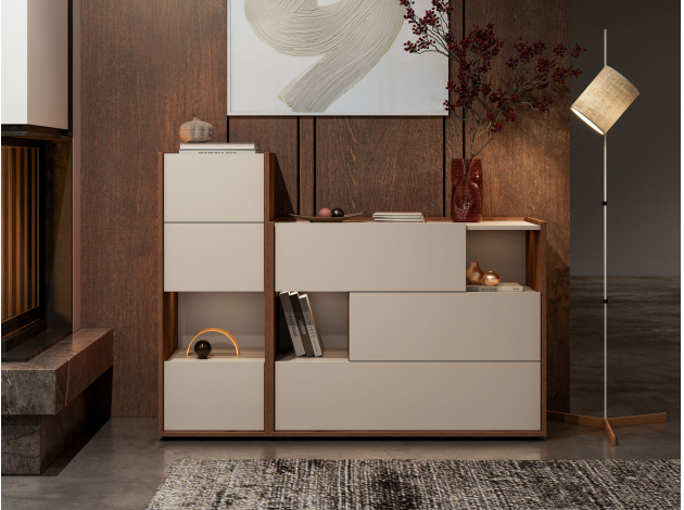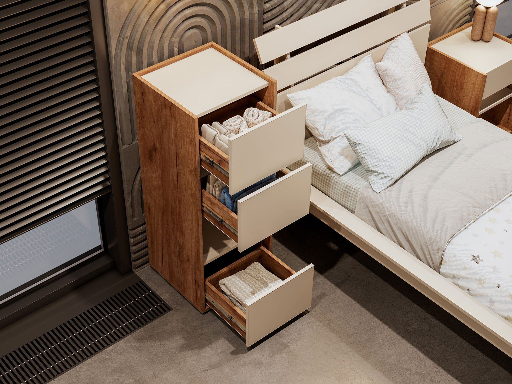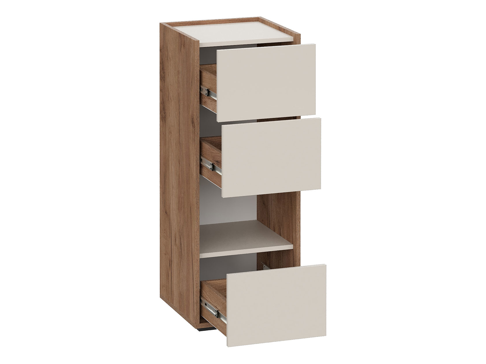 Комод Орма позволяет удобно хранить одежду, белье, аксессуары и важные мелочи. Выдвижные ящики открываются на полную глубину и обеспечивают быстрый доступ к содержимому. Открытая ниша помогает разнообразить пространство элементами декора. Древесная текстура корпуса добавляет обстановке уюта, а отсутствие ручек придает мебели лаконичность.