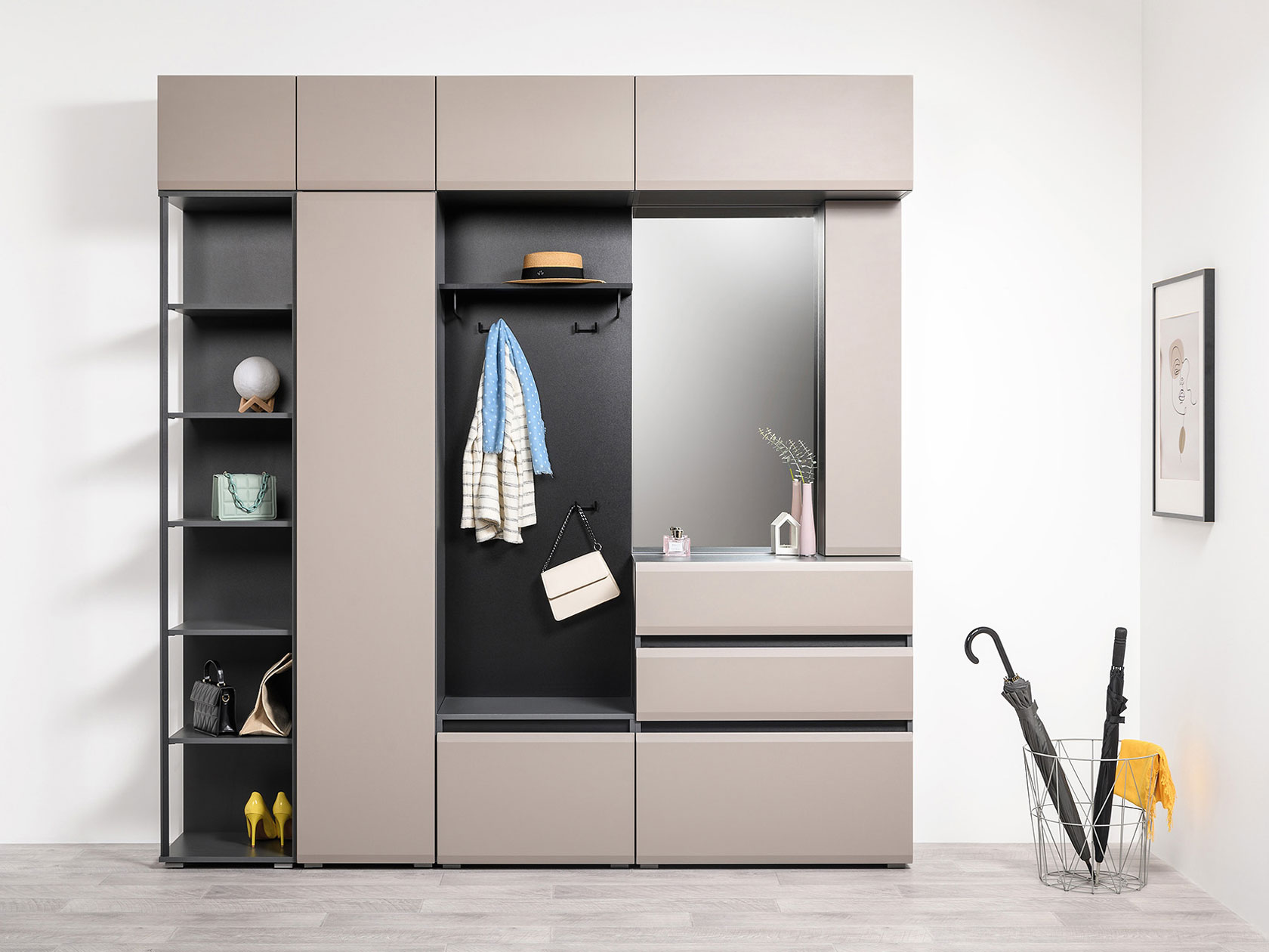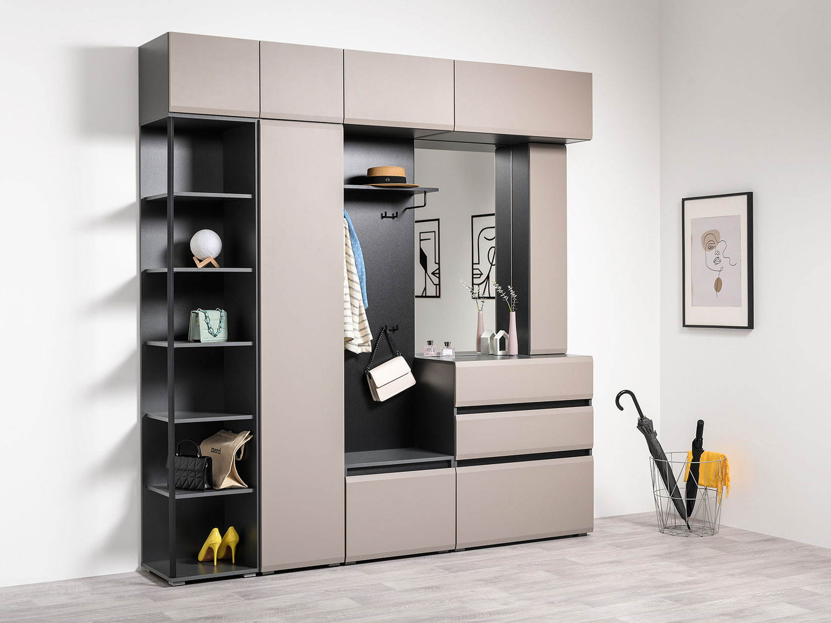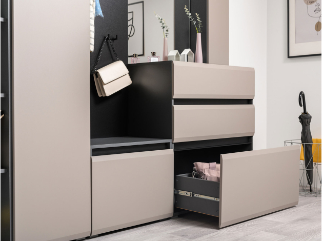 Комод Сидней поможет организовать порядок и аккуратное хранение вещей во входной зоне. Выдвижные ящики подходят для одежды, обуви и сезонных аксессуаров. Отсутствие ручек на матовых фасадах позволяет открывать дверцы за выступающий край.
