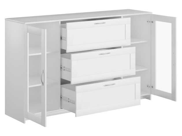Комод Сириус — прекрасное решение для хранения вещей в спальне, прихожей или гостиной. Вместительность делает модель функциональным элементом интерьера. Просторные ящики подходят для одежды, белья, книг, документов и других нужных вещей. Стеклянные вставки создают необычный визуальный акцент.