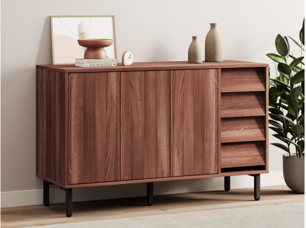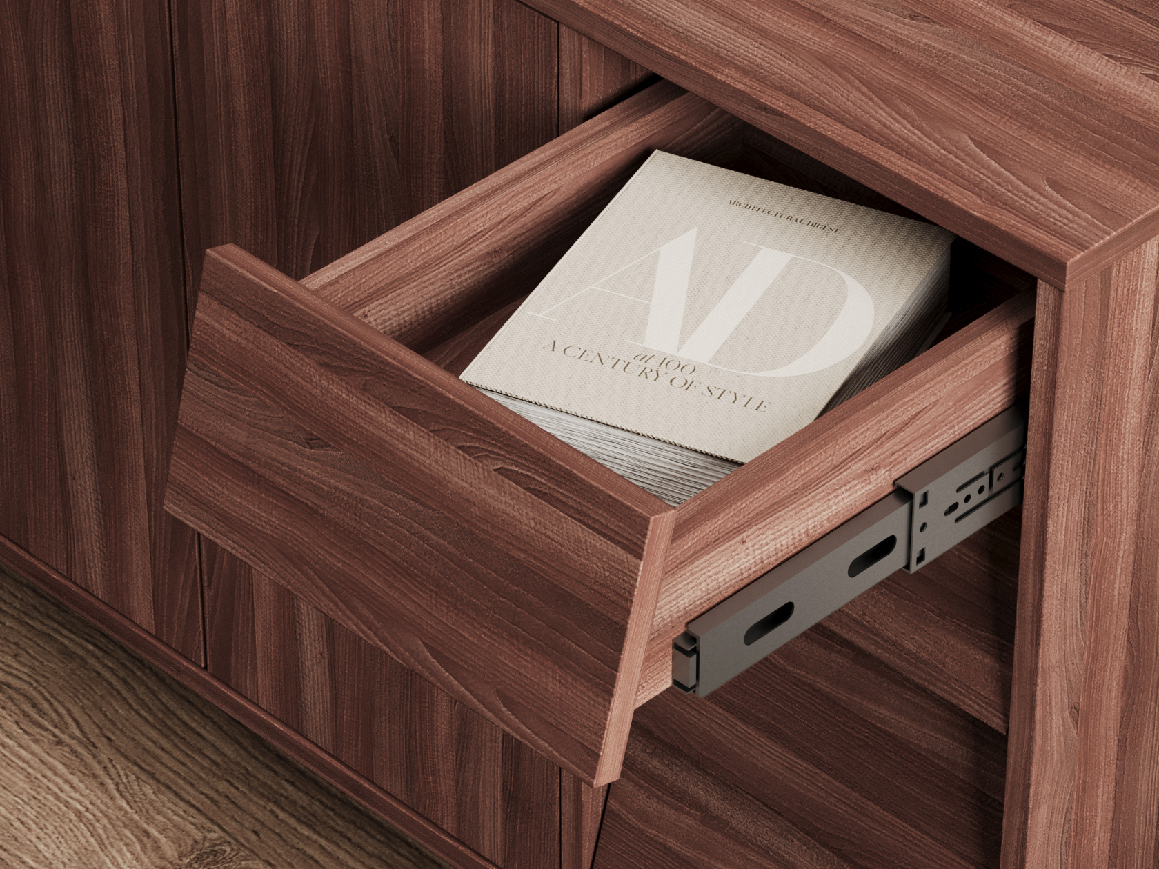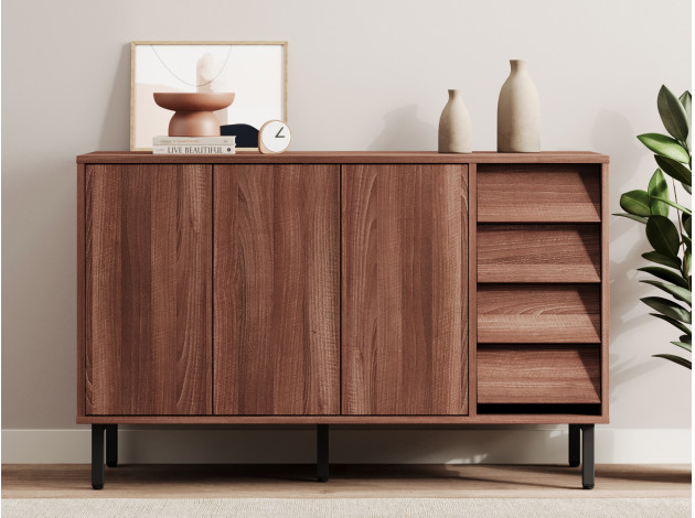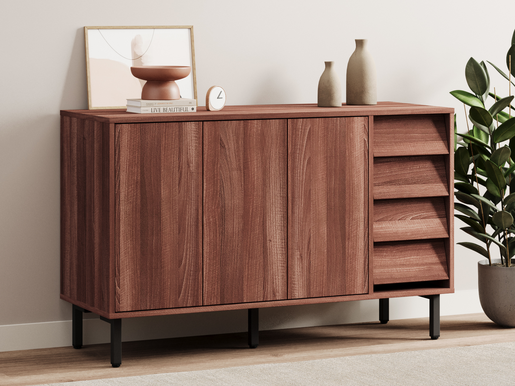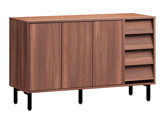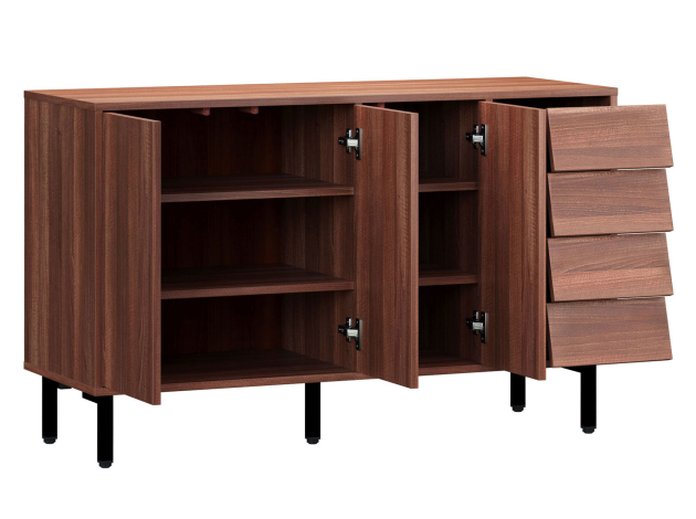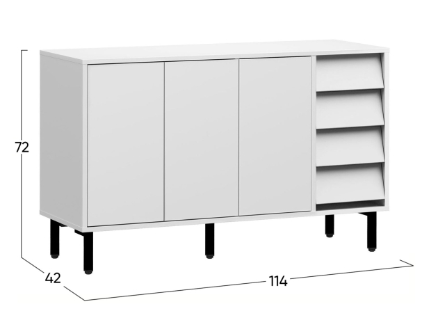 Комод Степ — элегантная модель для хранения в гостиной, спальне или прихожей. Комбинация распашных секций и выдвижных ящиков позволяет поддерживать порядок в любых вещах. Сочетание лаконичных фасадов и металлических опор гармонично смотрится в современной обстановке и не загромождает интерьер лишними деталями.