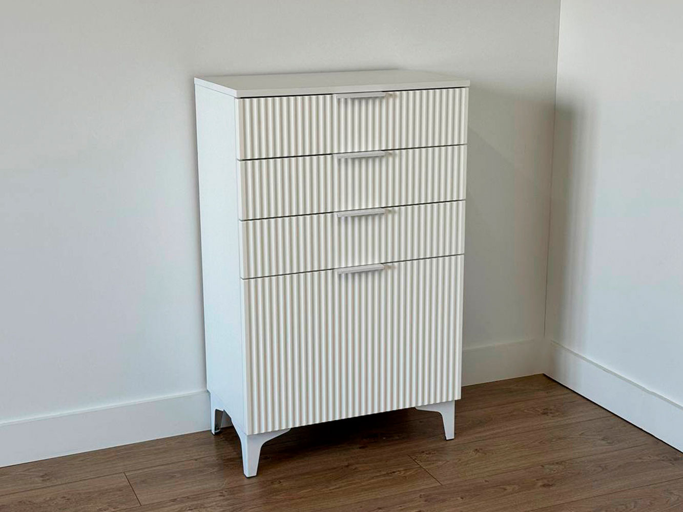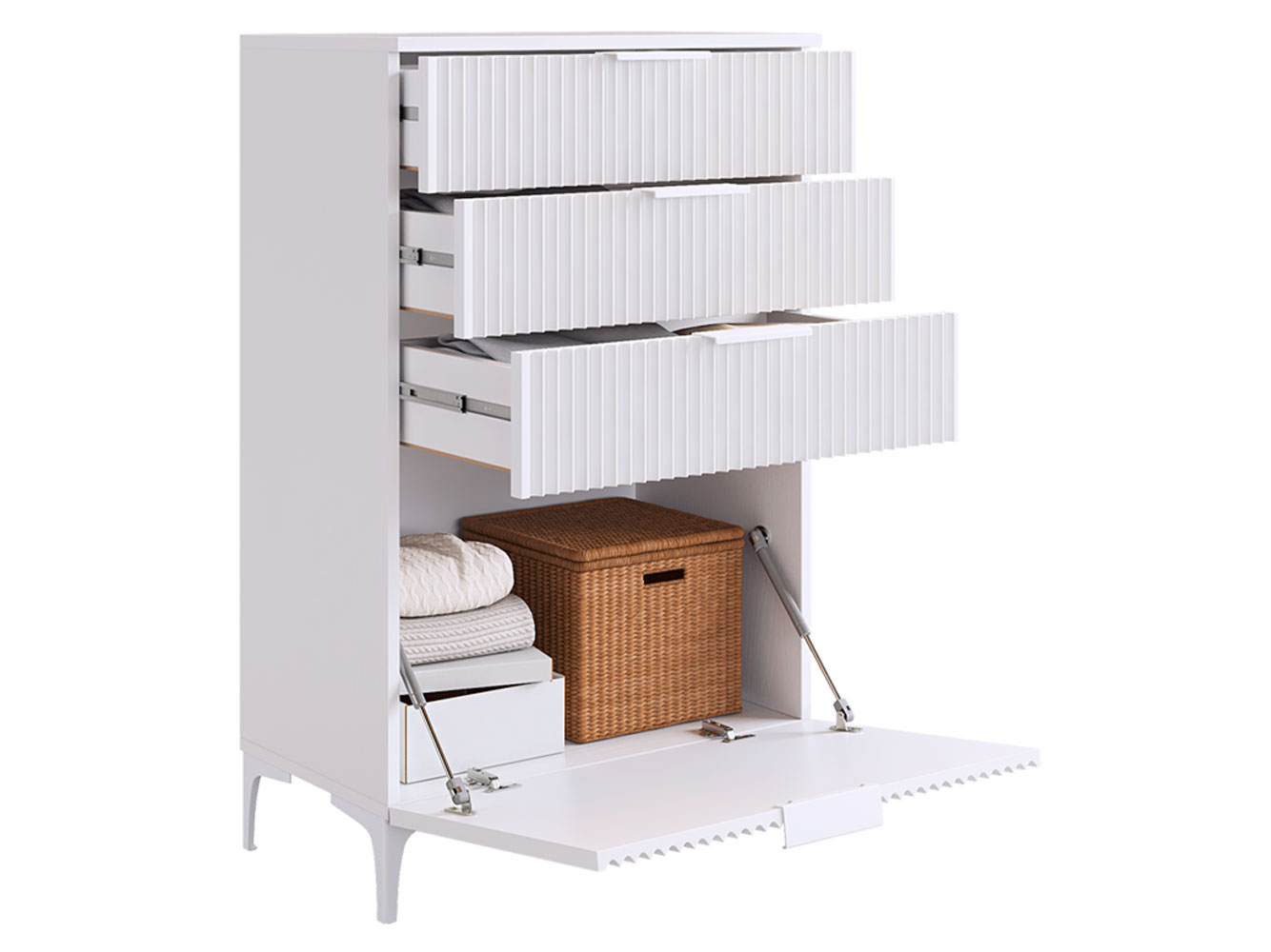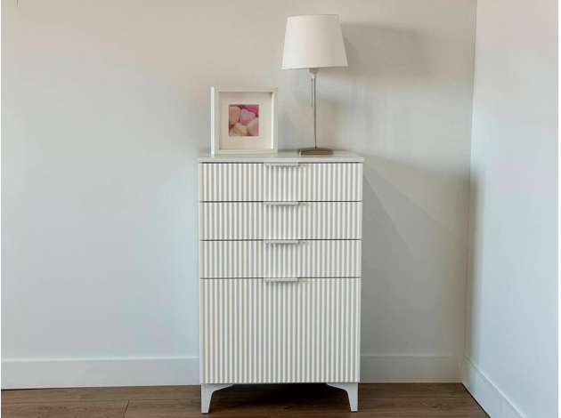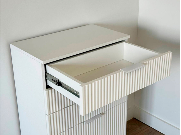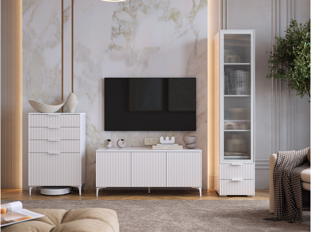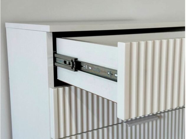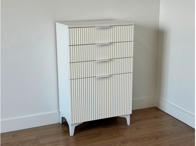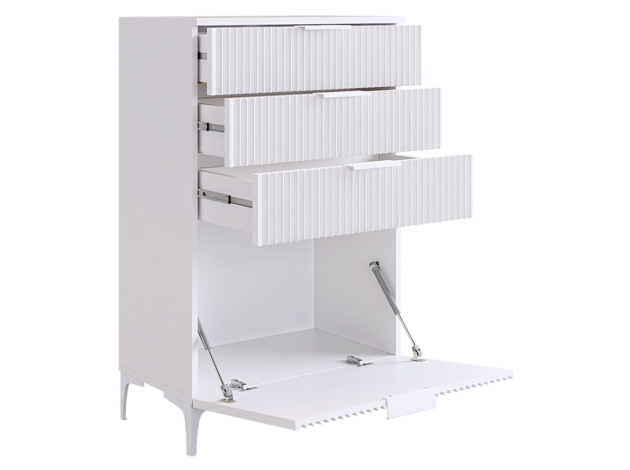 Комод Зефир украсит обстановку любой комнаты и обеспечит удобное хранение различных вещей. Выдвижные ящики и откидные дверцы позволяют оптимально распределить всё необходимое. Фрезеровка на фасадах и ножки в цвет фурнитуры делают модель стильным акцентом современного интерьера.