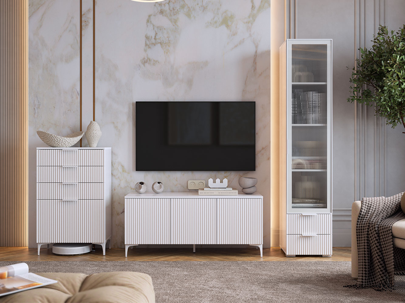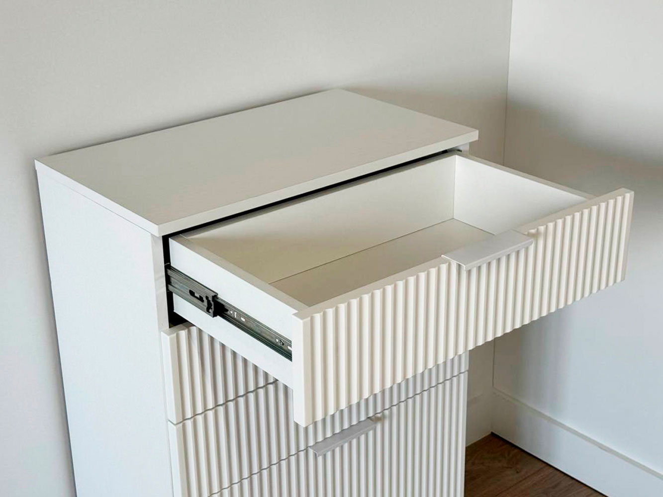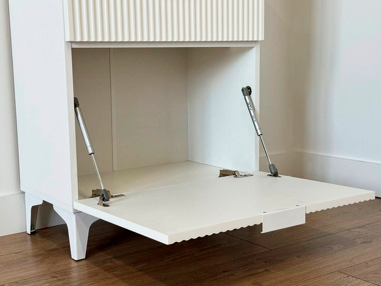 Комод Зефир украсит обстановку любой комнаты и обеспечит удобное хранение различных вещей. Выдвижные ящики и откидные дверцы позволяют оптимально распределить всё необходимое. Фрезеровка на фасадах и ножки в цвет фурнитуры делают модель стильным акцентом современного интерьера.