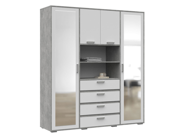 Спальный гарнитур Амбер создаст комфортное пространство с практичным функционалом и единым стилем оформления. Кровать в окружении тумбочек позволит удобно расположиться во время отдыха. Для гардероба и других нужных вещей предусмотрен вместительный и функциональный шкаф с ящиками и зеркалами.