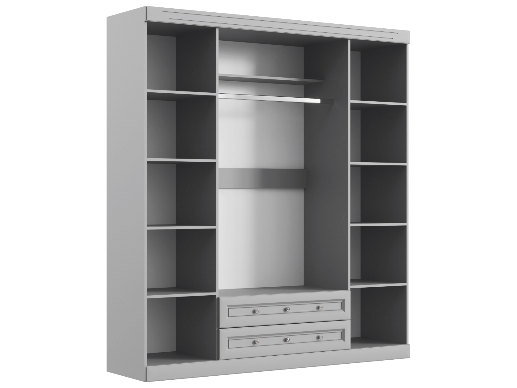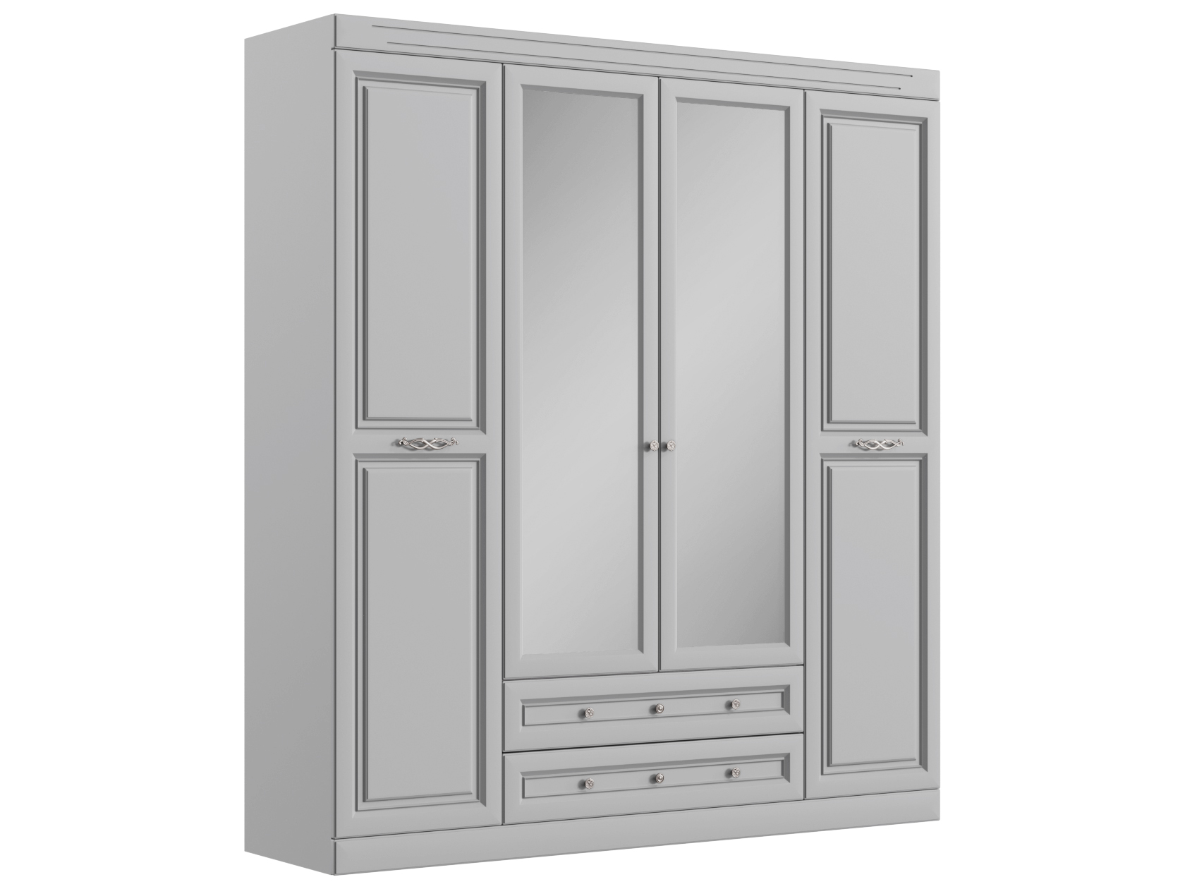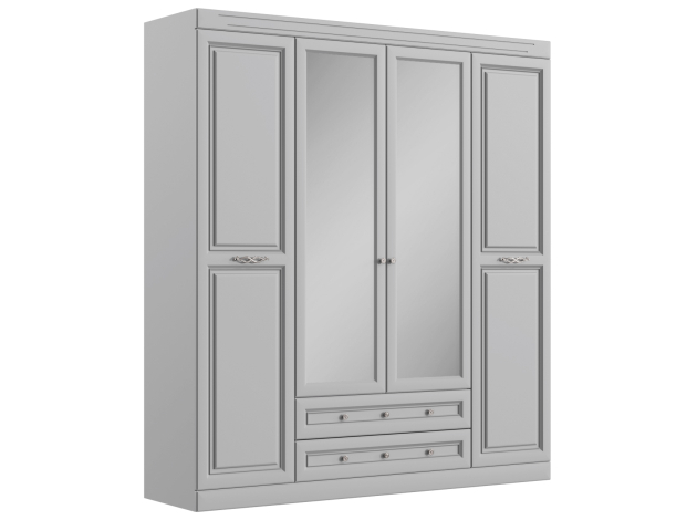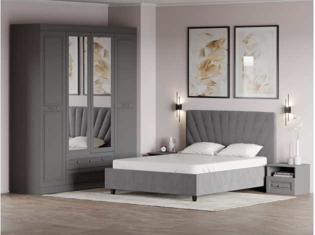 Спальный гарнитур Аврора — воплощение элегантности и уюта. Матовые фасады с фрезеровкой и мягкая обивка кровати создают спокойную атмосферу. Благодаря высоким зеркалам комната выглядит визуально объемнее и светлее. Просторный шкаф подходит для размещения предметов гардероба и других вещей, которые удобно хранить в спальне.