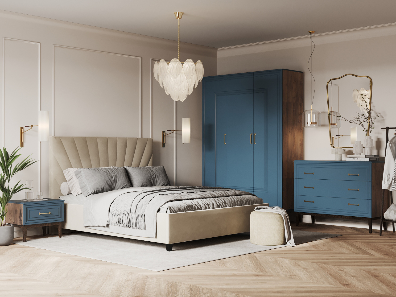 Спальный гарнитур Эвора Макси Сапфировый лак, МДФ / Таксус, ЛДСП / Кремовый, велюр