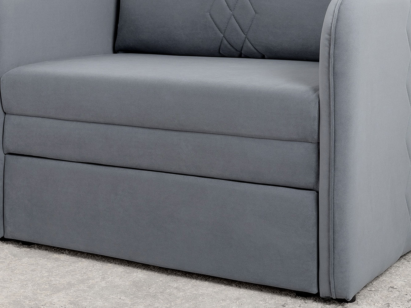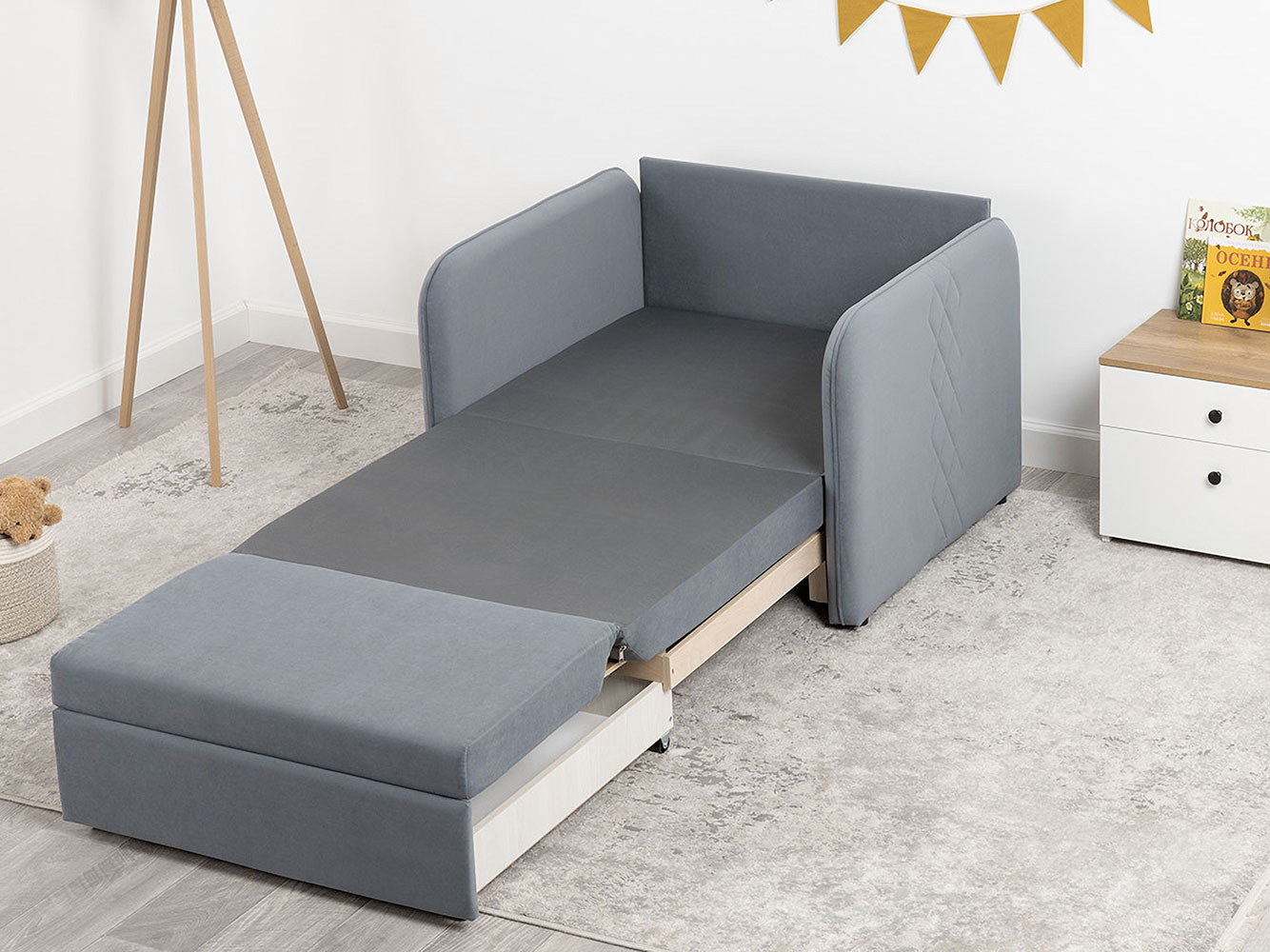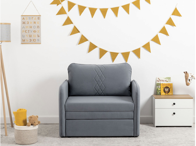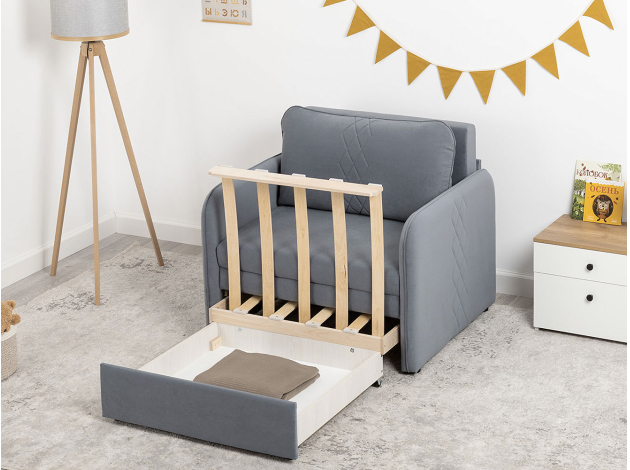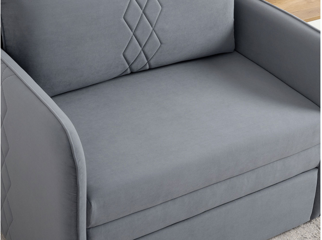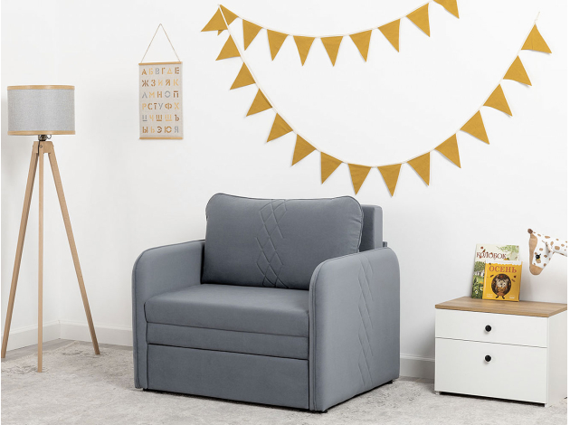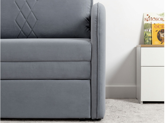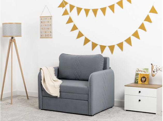 Кресло-кровать Юта привлекает компактными габаритами и функциональностью, поэтому идеально для комнаты с ограниченным пространством. Декоративная строчка на подушках и подлокотниках создает интересные акценты дизайна. Механизм трансформации быстро превращает модель в спальное место для детей и подростков. Небольшой ящик в выкатной части подойдет для хранения постельных принадлежностей.