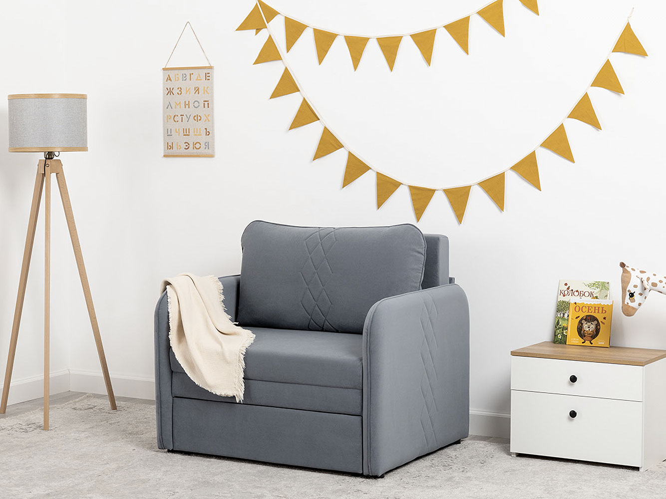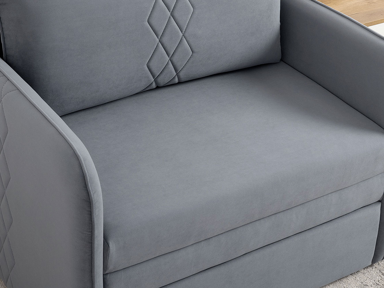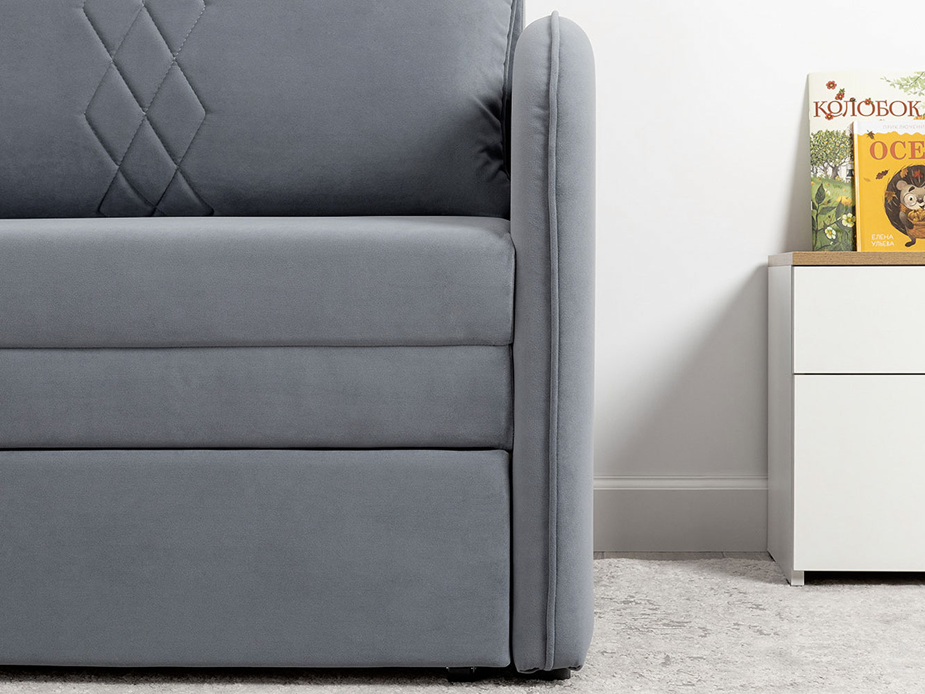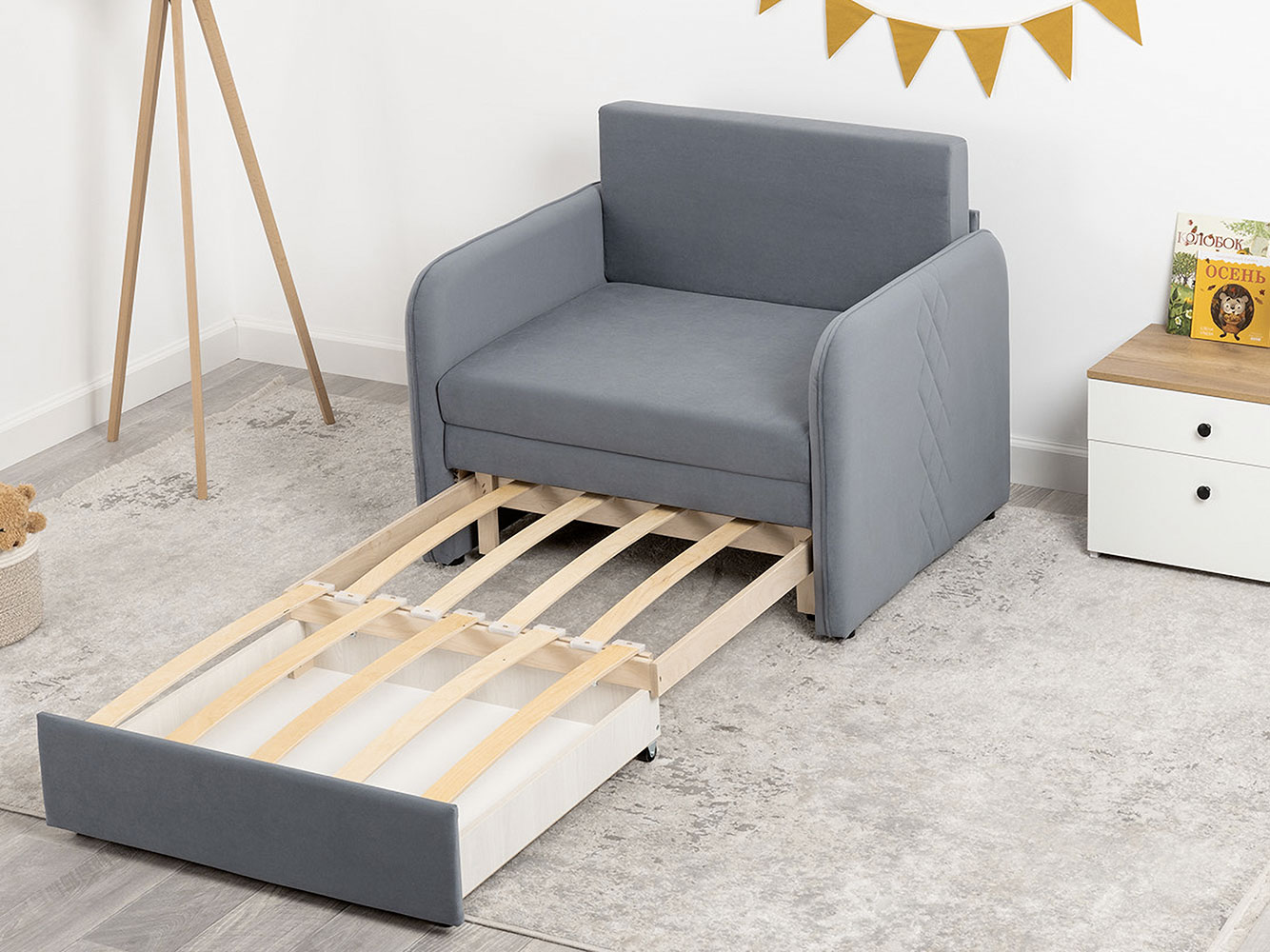 Кресло-кровать Юта привлекает компактными габаритами и функциональностью, поэтому идеально для комнаты с ограниченным пространством. Декоративная строчка на подушках и подлокотниках создает интересные акценты дизайна. Механизм трансформации быстро превращает модель в спальное место для детей и подростков. Небольшой ящик в выкатной части подойдет для хранения постельных принадлежностей.