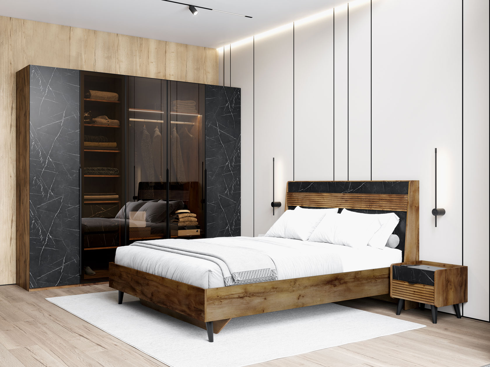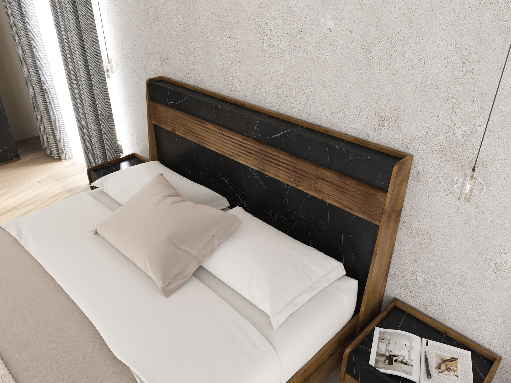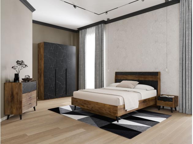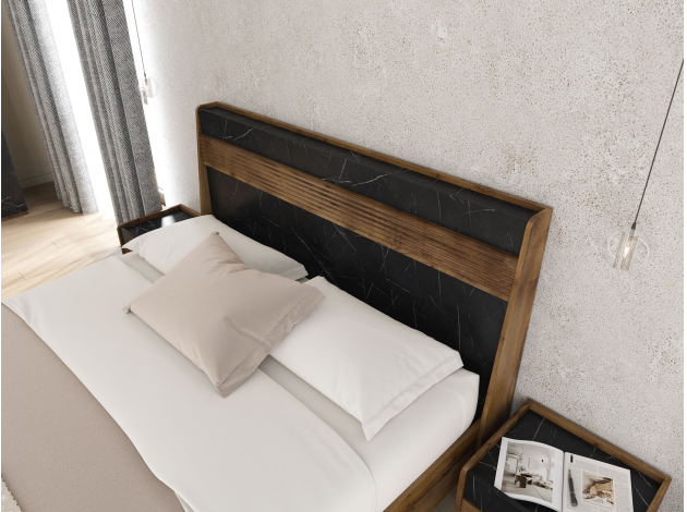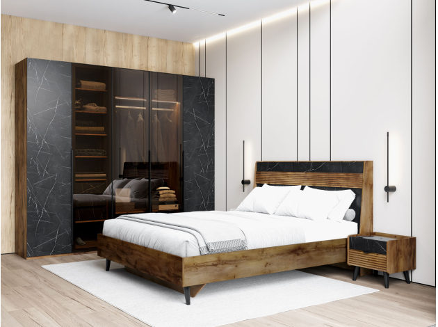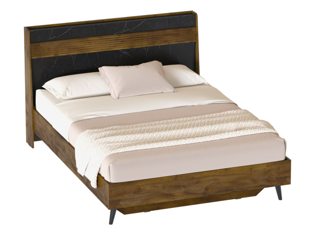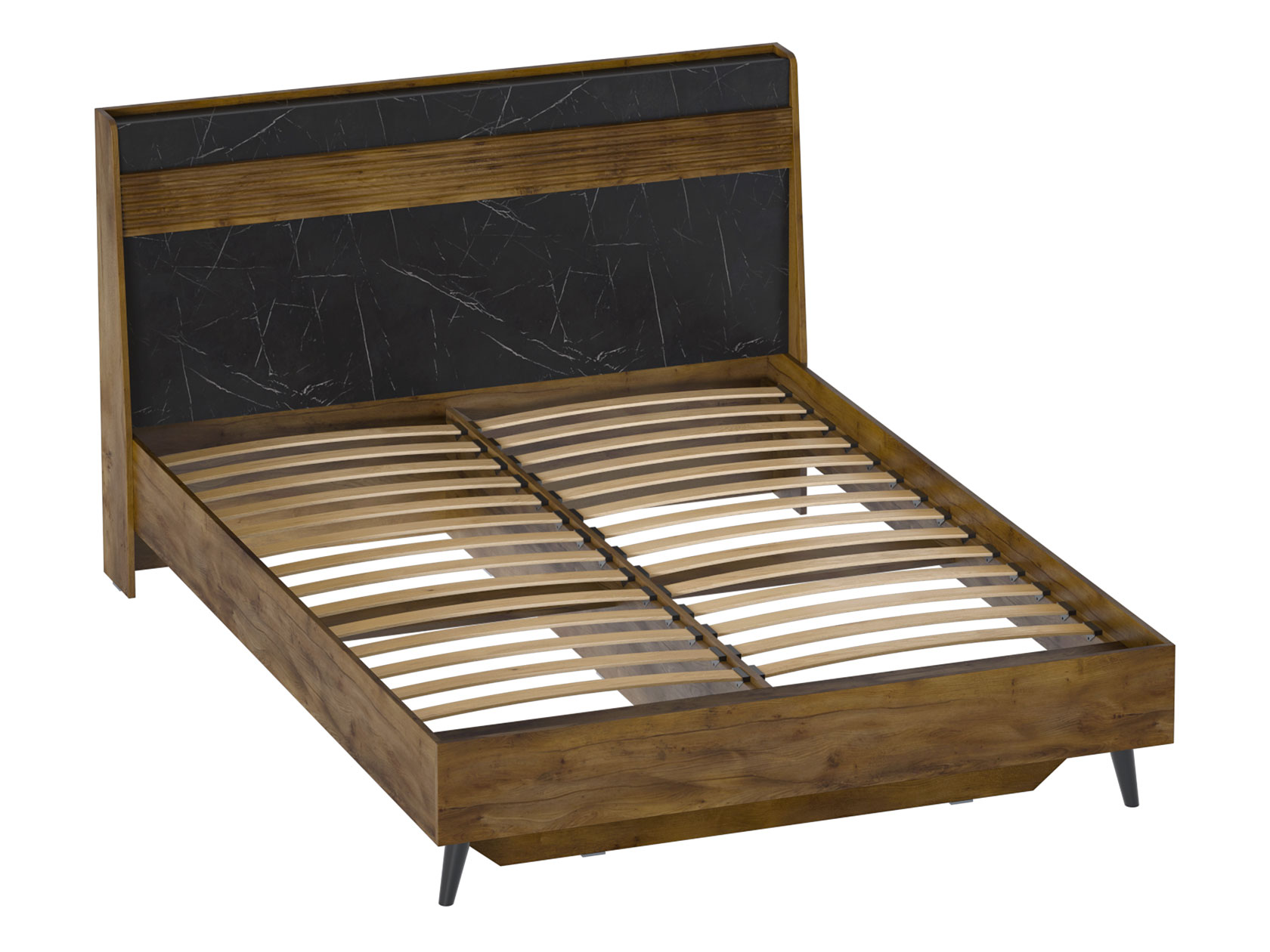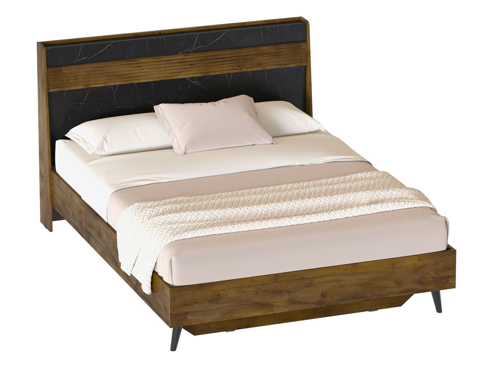 Двуспальная кровать Браун выполнена в благородных оттенках, которые ассоциируются с респектабельностью, спокойствием и гармонией. Высокое изголовье с небольшими бортиками декорировано текстурой мрамора и фактурной накладкой. Основание с ламелями амортизирует нагрузку на матрас и способствует естественной вентиляции, продлевая срок его службы.