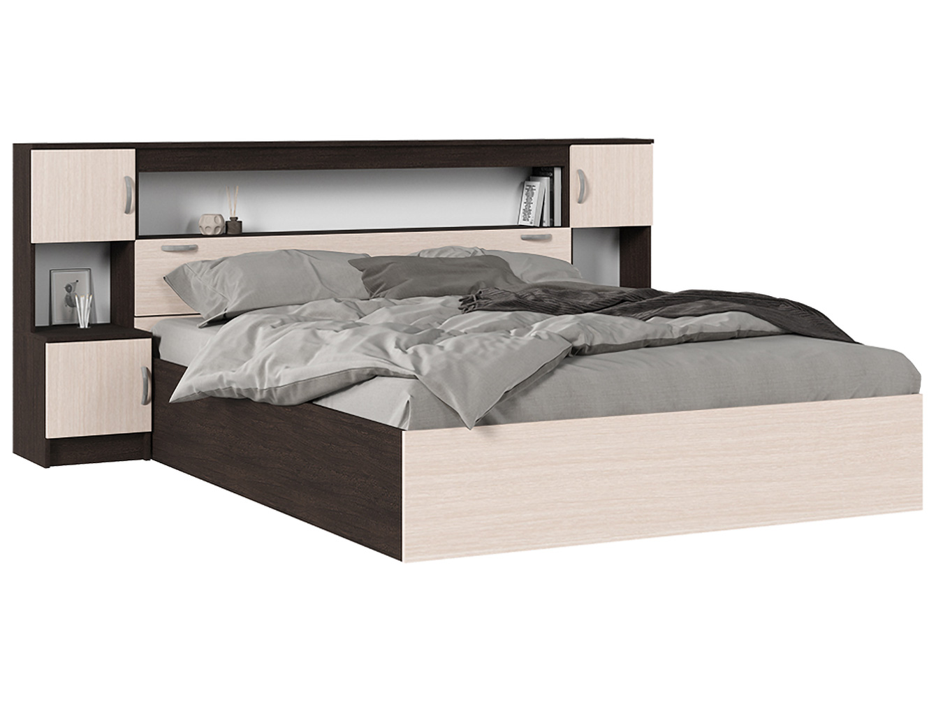 Двуспальная кровать Бриз — практичное решение для небольшой квартиры или студии. Большое количество полок создает дополнительное место для хранения самых разных вещей: от книг и декора до пледов и аксессуаров. Кровать оформлена в древесном оттенке, который создает уютную атмосферу спальни.