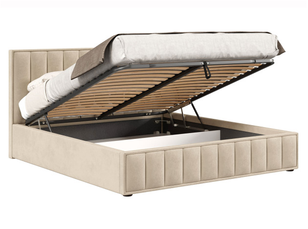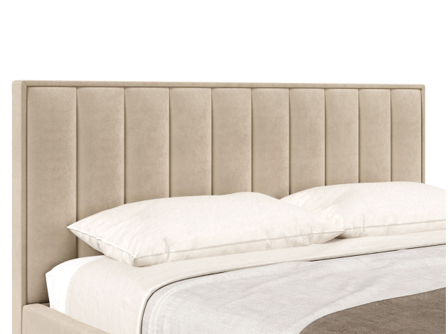 В дизайне кровати с подъемным механизмом Шерон ПМ удачно сочетаются эстетика сдержанной роскоши, индивидуальность и практичность. Мягкая обивка создает атмосферу уюта, а основание с ламелями заботится о комфортном сне. Изюминка модели — повторяющийся декор, который используется в оформлении спинки и изножья. Вертикальные строчки подчеркивают симметрию и правильные линии кровати.
