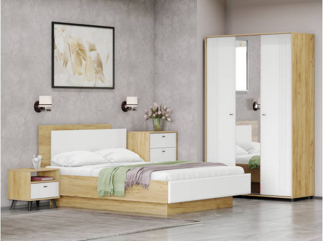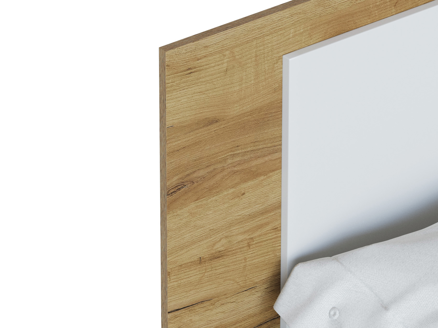 Двуспальная кровать Милан выполнена в приятной цветовой гамме, которая наполняет комнату уютом. Необычная форма изголовья и декоративная накладка с фрезеровкой служат стильными акцентами.