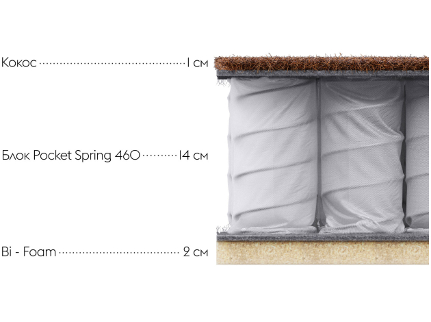 Пружинный матрас First SX 19 — самый жесткий в одноименной линейке базовых моделей. Это отличный вариант для дачи, съемной квартиры или гостевой комнаты. Пружинный блок Pocket Spring 460 обеспечивает правильное положение во сне, а натуральный наполнитель кокос придает матрасу необходимую жесткость. Упругий слой Bi-foam немного прогибается под нагрузкой, хорошо поддерживая всё тело.